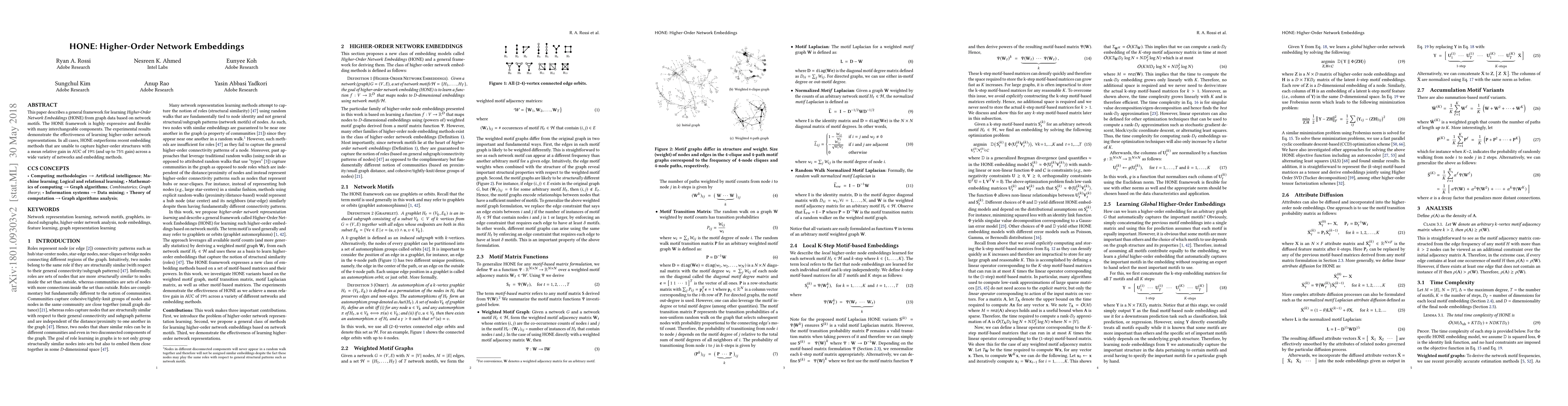 This paper introduces HONE, a flexible framework for learning higher-order network embeddings from graph data using network motifs, demonstrating superior performance over recent embedding methods with a mean relative gain in AUC of $19\%$.