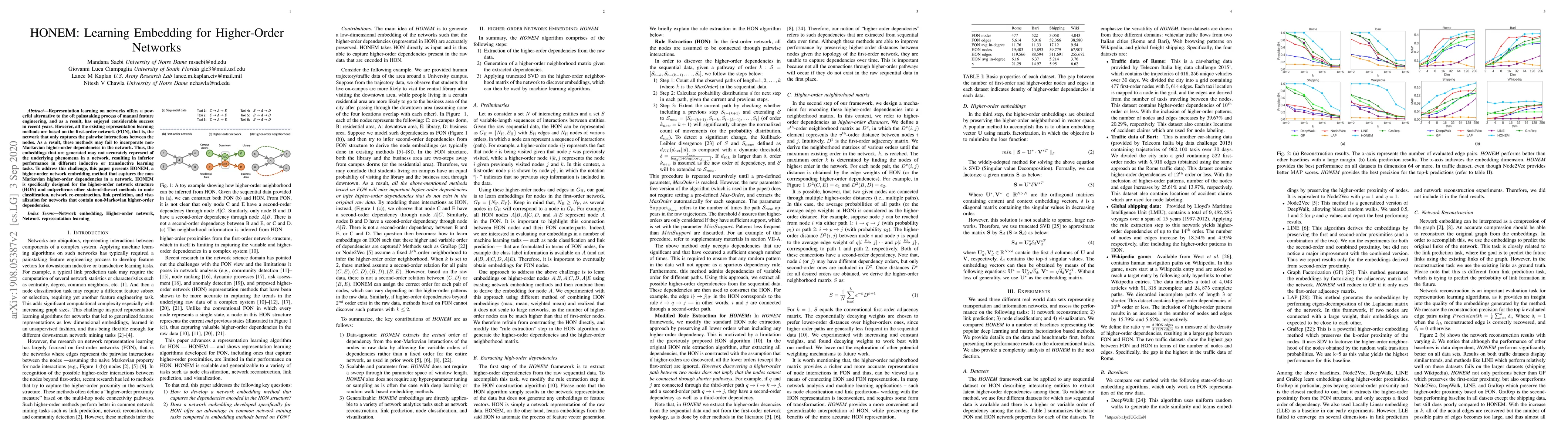 HONEM is a new method for learning embeddings in higher-order networks, which capture non-Markovian dependencies to improve performance on tasks like node classification and link prediction.