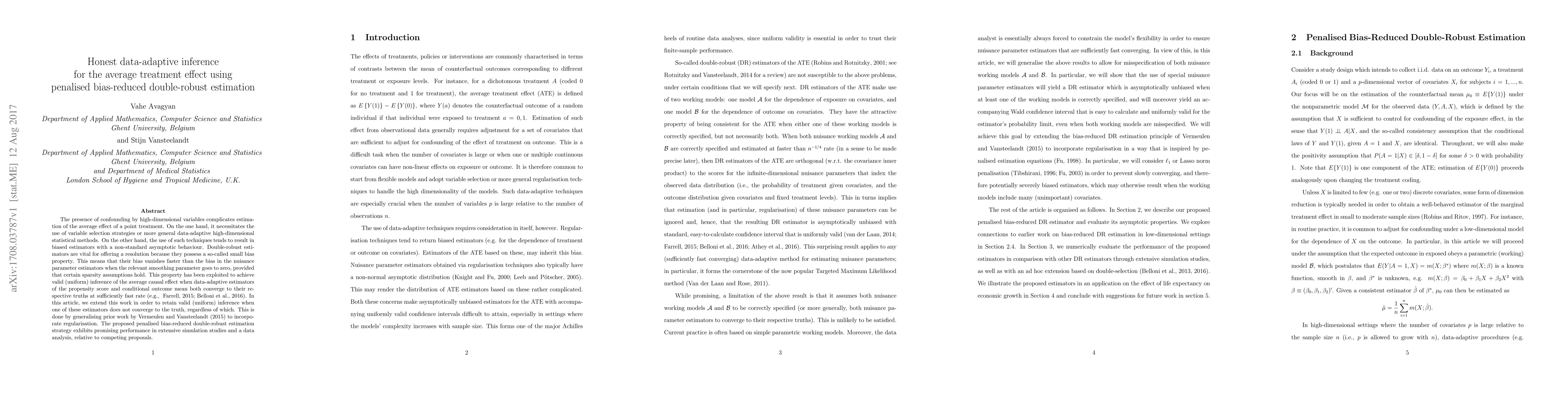 The presence of confounding by high-dimensional variables complicates estimation of the average effect of a point treatment. On the one hand, it necessitates the use of variable selection strategies or more general data-adaptive high-dimensional statistical methods. On the other hand, the use of such techniques tends to result in biased estimators with a non-standard asymptotic behaviour. Double-robust estimators are vital for offering a resolution because they possess a so-called small bias property (Newey et al., 2004). This means that their bias vanishes faster than the bias in the nuisance parameter estimators when the relevant smoothing parameter goes to zero, making their performance less sensitive to smoothing (Chernozhukov et al., 2016). This property has been exploited to achieve valid (uniform) inference of the average causal effect when data-adaptive estimators of the propensity score and conditional outcome mean both converge to their respective truths at sufficiently fast rate (e.g., van der Laan, 2014; Farrell, 2015; Belloni et al., 2016). In this article, we extend this work in order to retain valid (uniform) inference when one of these estimators does not converge to the truth, regardless of which. This is done by generalising prior work for low-dimensional settings by Vermeulen and Vansteelandt (2015) to incorporate regularisation. The proposed penalised bias-reduced double-robust estimation strategy exhibits promising performance in extensive simulation studies and a data analysis, relative to competing proposals.