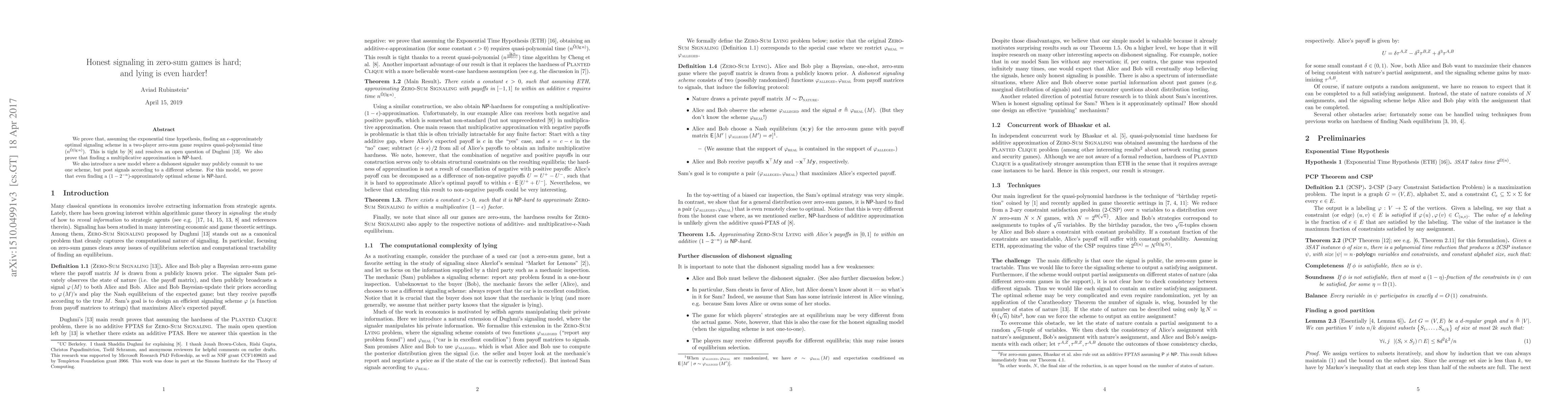 The paper proves that finding optimal signaling schemes in zero-sum games is computationally challenging under the exponential time hypothesis, and lying (dishonest signaling) is even harder. It also introduces a new model where committing to a scheme but signaling according to another is shown to be NP-hard to approximate well.