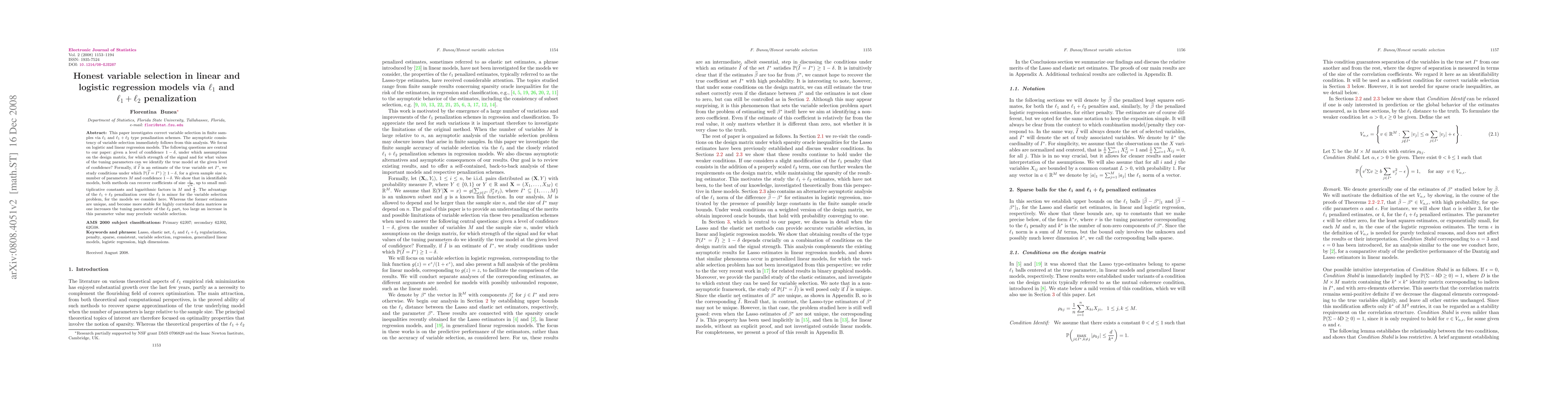 This paper explores variable selection in linear and logistic regression models using $\ell_1$ and $\ell_1+\ell_2$ penalization, focusing on achieving correct model identification at a specified confidence level. It finds that both methods can identify true variables at a rate of $\frac{1}{\sqrt{n}}$, though $\ell_1+\ell_2$ offers stability benefits for correlated data at the cost of potentially hindering variable selection.