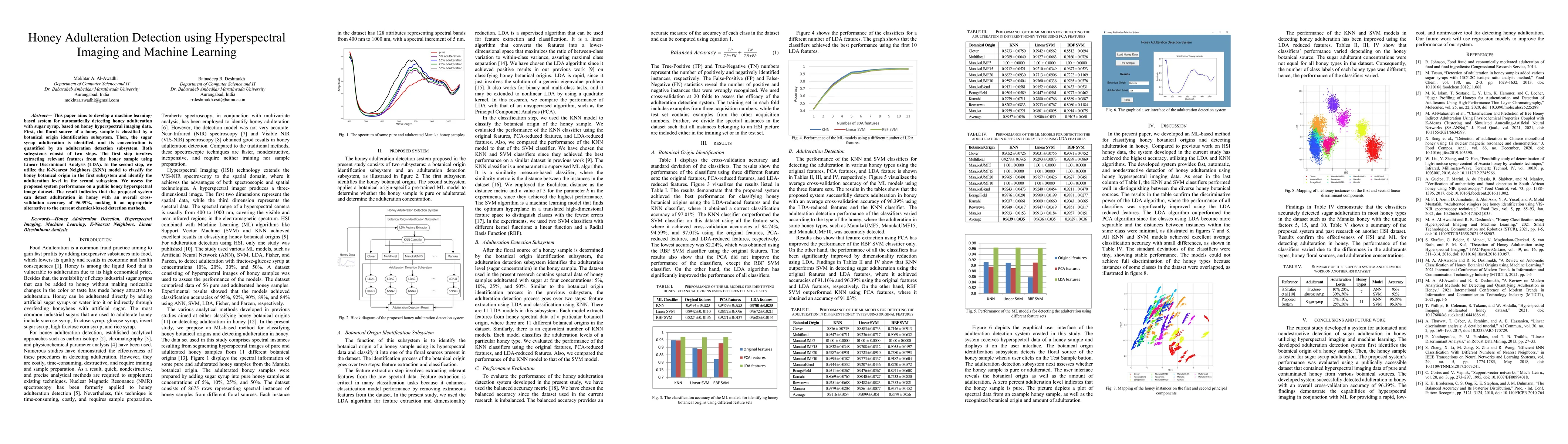 This paper aims to develop a machine learning-based system for automatically detecting honey adulteration with sugar syrup, based on honey hyperspectral imaging data. First, the floral source of a honey sample is classified by a botanical origin identification subsystem. Then, the sugar syrup adulteration is identified, and its concentration is quantified by an adulteration detection subsystem. Both subsystems consist of two steps. The first step involves extracting relevant features from the honey sample using Linear Discriminant Analysis (LDA). In the second step, we utilize the K-Nearest Neighbors (KNN) model to classify the honey botanical origin in the first subsystem and identify the adulteration level in the second subsystem. We assess the proposed system performance on a public honey hyperspectral image dataset. The result indicates that the proposed system can detect adulteration in honey with an overall cross-validation accuracy of 96.39%, making it an appropriate alternative to the current chemical-based detection methods.
