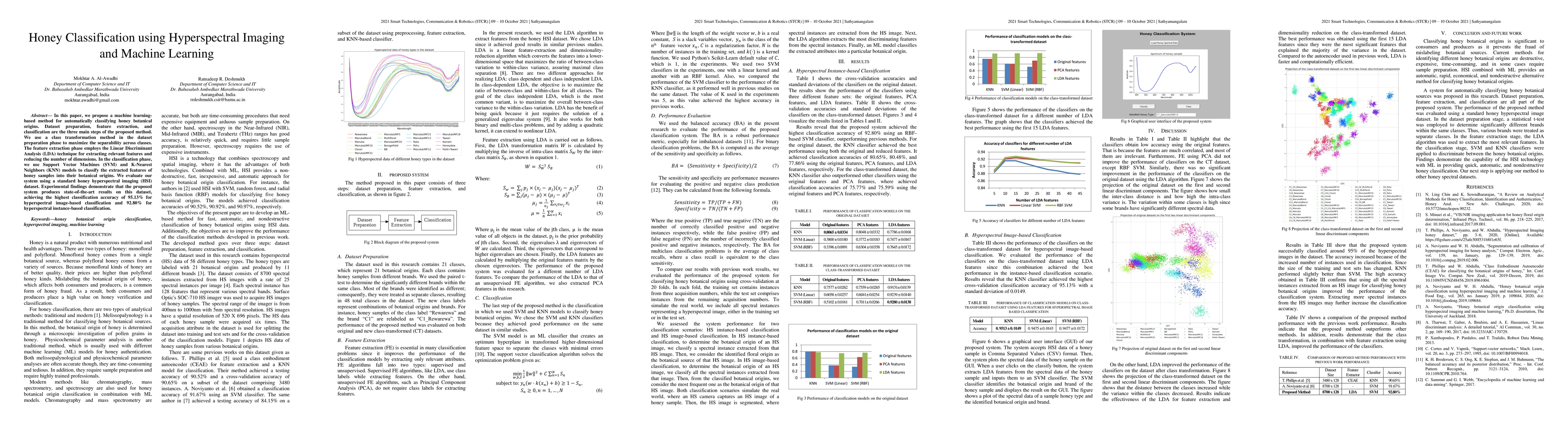 The paper presents a detailed methodology for honey classification using hyperspectral imaging, LDA feature extraction, and SVM/KNN classification, demonstrating state-of-the-art results.