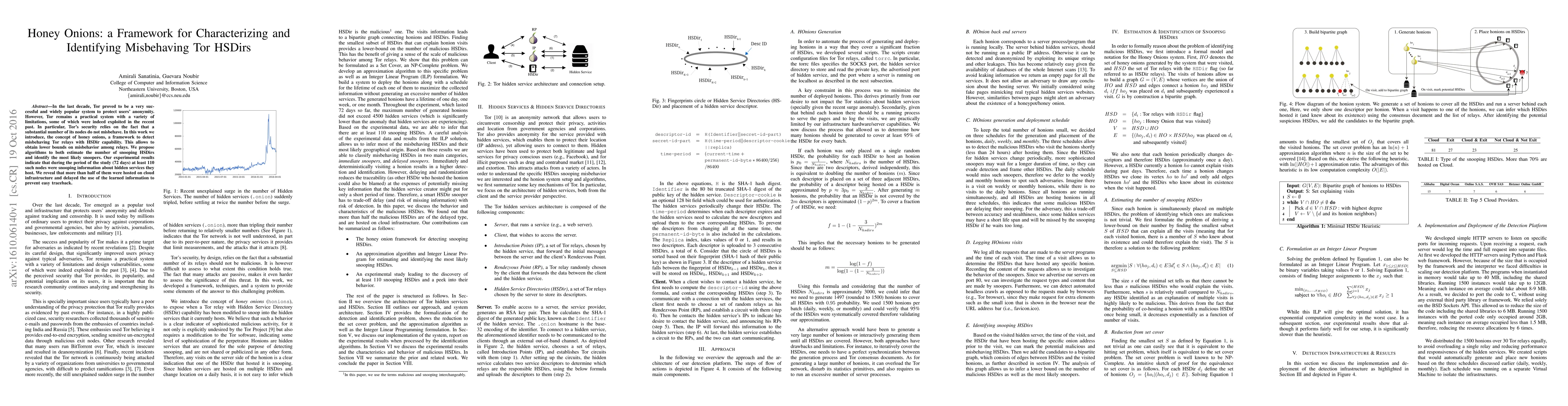 This paper introduces "honey onions," a framework to detect misbehaving Tor HSDirs that snoop on hidden service information. The study reveals that at least 110 nodes were snooping over a 72-day period, with many hosted on cloud infrastructure to delay traceback.