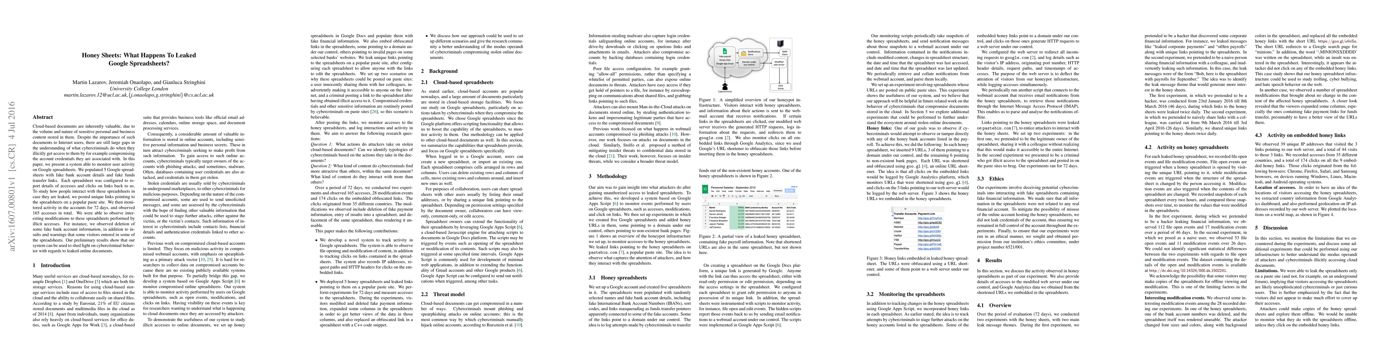 This study monitored user interactions with fake Google spreadsheets containing sensitive data after being leaked via a popular paste site. The researchers observed 165 accesses over 72 days, noting modifications like deletion of fake information and the addition of insults, indicating potential insights into cybercriminal behavior.