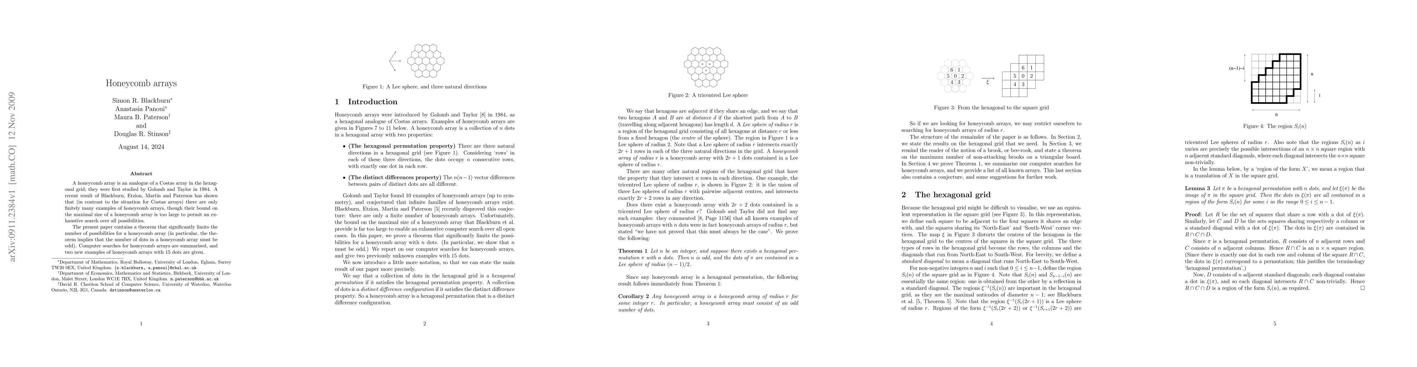 This paper proves a theorem that significantly reduces the number of potential honeycomb arrays, specifically showing that their number of dots must be odd. Additionally, it summarizes recent computer searches and presents two new examples of honeycomb arrays with 15 dots.