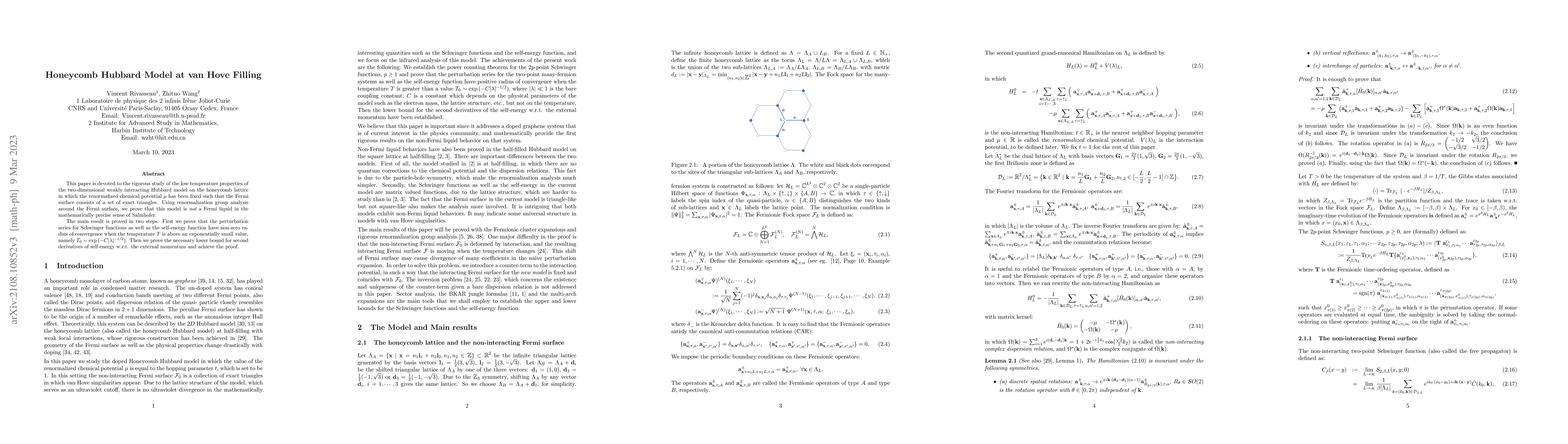This paper rigorously examines the low-temperature properties of the two-dimensional weakly interacting Hubbard model on a honeycomb lattice at van Hove filling, showing that the model is not a Fermi liquid. The study uses renormalization group analysis to demonstrate that the perturbation series for Schwinger and self-energy functions have non-zero radius of convergence above an exponentially small temperature.