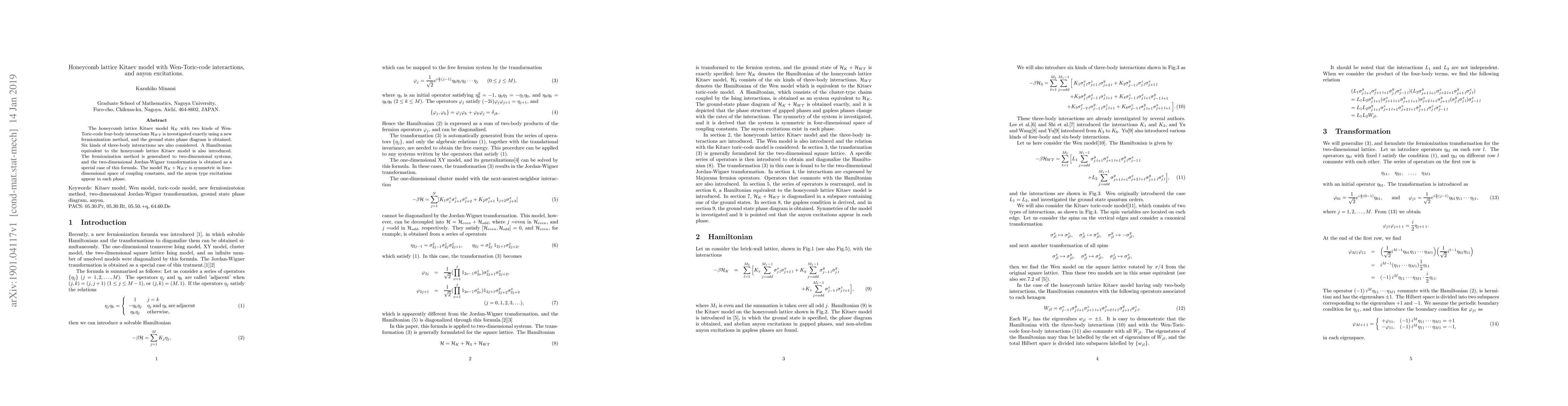 This paper investigates the honeycomb lattice Kitaev model with Wen-Toric-code interactions using a new fermionization method, revealing a ground state phase diagram and the presence of anyon excitations in each phase. The study also generalizes the fermionization method to two-dimensional systems, introducing a Hamiltonian equivalent to the Kitaev model and deriving the two-dimensional Jordan-Wigner transformation.