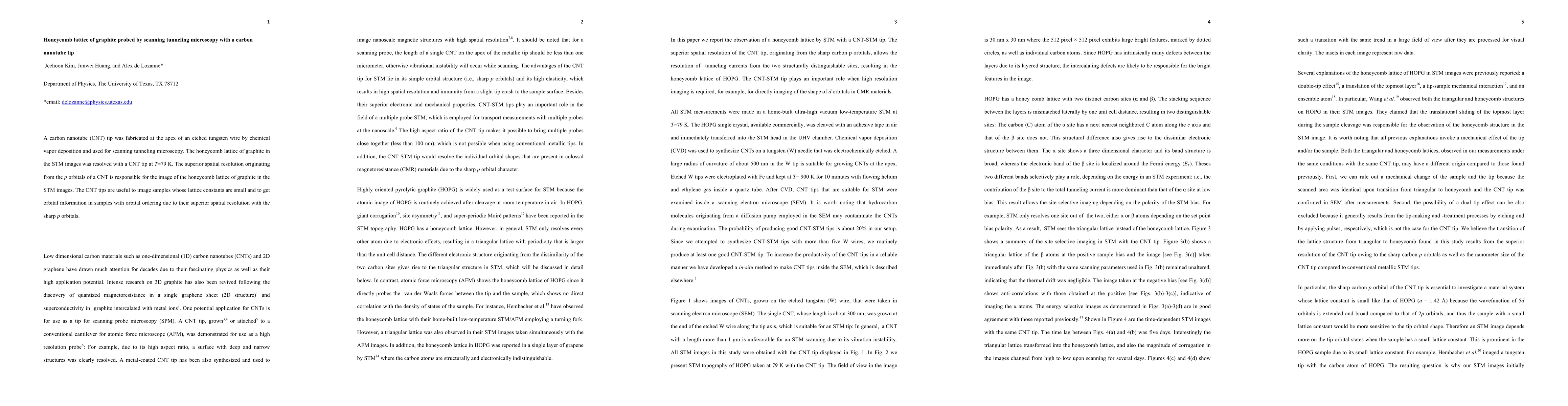 A carbon nanotube (CNT) tip was fabricated at the apex of an etched tungsten wire by chemical vapor deposition and used for scanning tunneling microscopy. The honeycomb lattice of graphite in the STM images was resolved with a CNT tip at T=79 K. The superior spatial resolution originating from the p orbitals of a CNT is responsible for the image of the honeycomb lattice of graphite in the STM images. The CNT tips are useful to image samples whose lattice constants are small and to get orbital information in samples with orbital ordering due to their superior spatial resolution with the sharp p orbitals.