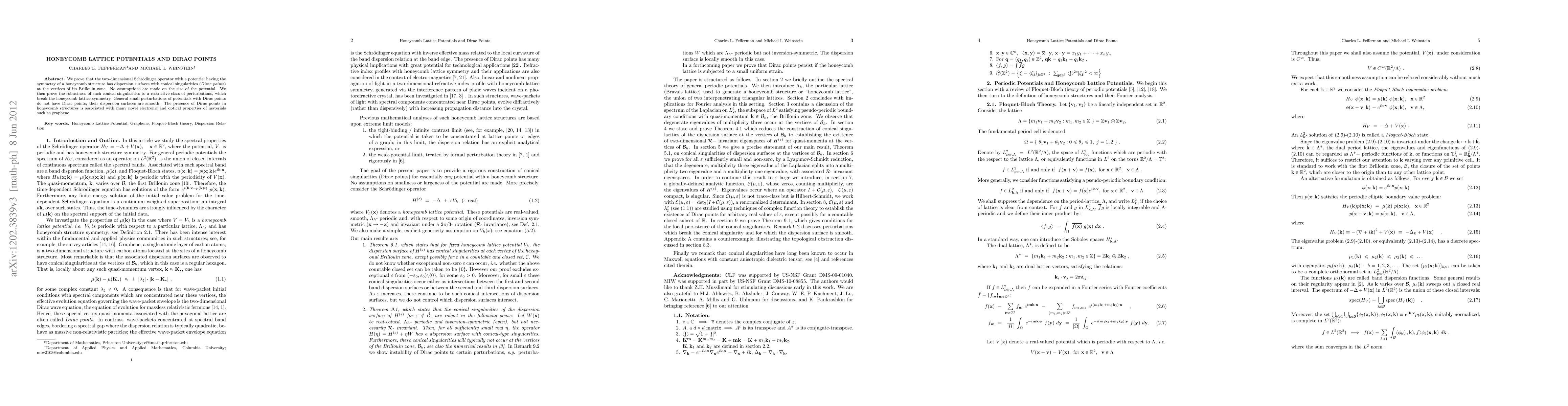 This paper demonstrates that a two-dimensional Schrödinger operator with a honeycomb lattice potential exhibits conical singularities, or Dirac points, at the Brillouin zone vertices. It also proves the robustness of these Dirac points against certain symmetry-breaking perturbations, highlighting their significance in materials like graphene with unique electronic and optical properties.