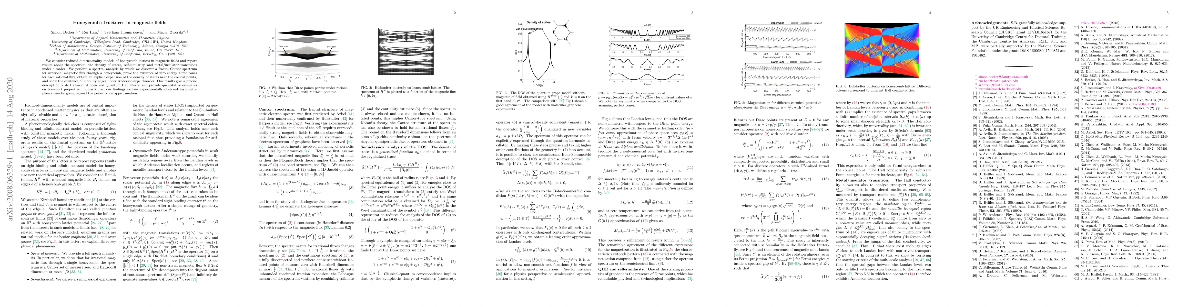 We consider reduced-dimensionality models of honeycomb lattices in magnetic fields and report results about the spectrum, the density of states, self-similarity, and metal/insulator transitions under disorder. We perform a spectral analysis by which we discover a fractal Cantor spectrum for irrational magnetic flux through a honeycomb, prove the existence of zero energy Dirac cones for each rational flux, obtain an explicit expansion of the density of states near the conical points, and show the existence of mobility edges under Anderson-type disorder. Our results give a precise description of de Haas-van Alphen and Quantum Hall effects, and provide quantitative estimates on transport properties. In particular, our findings explain experimentally observed asymmetry phenomena by going beyond the perfect cone approximation.
