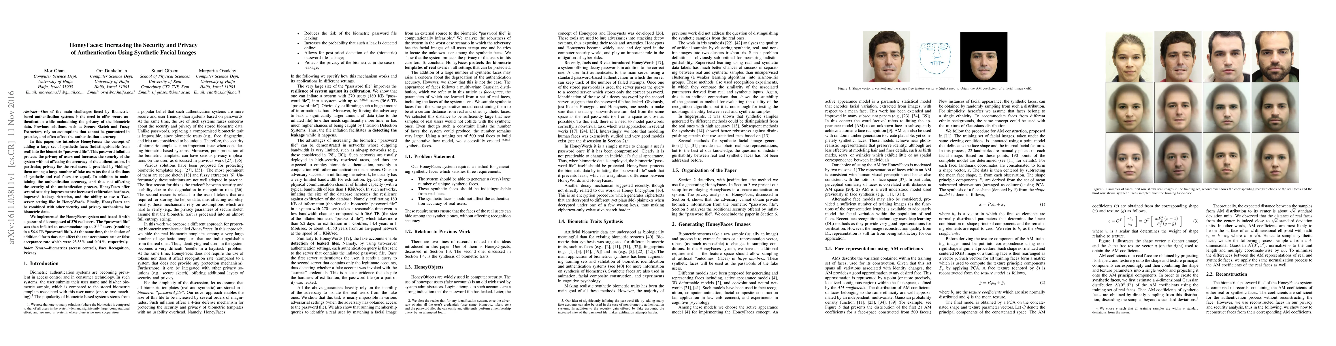 HoneyFaces introduces synthetic facial images to enhance biometric authentication security and privacy by inflating the "password file" with fake faces, thereby protecting real users' privacy without compromising accuracy. This method improves security through increased exfiltration hardness, better leakage detection, and compatibility with two-server settings.