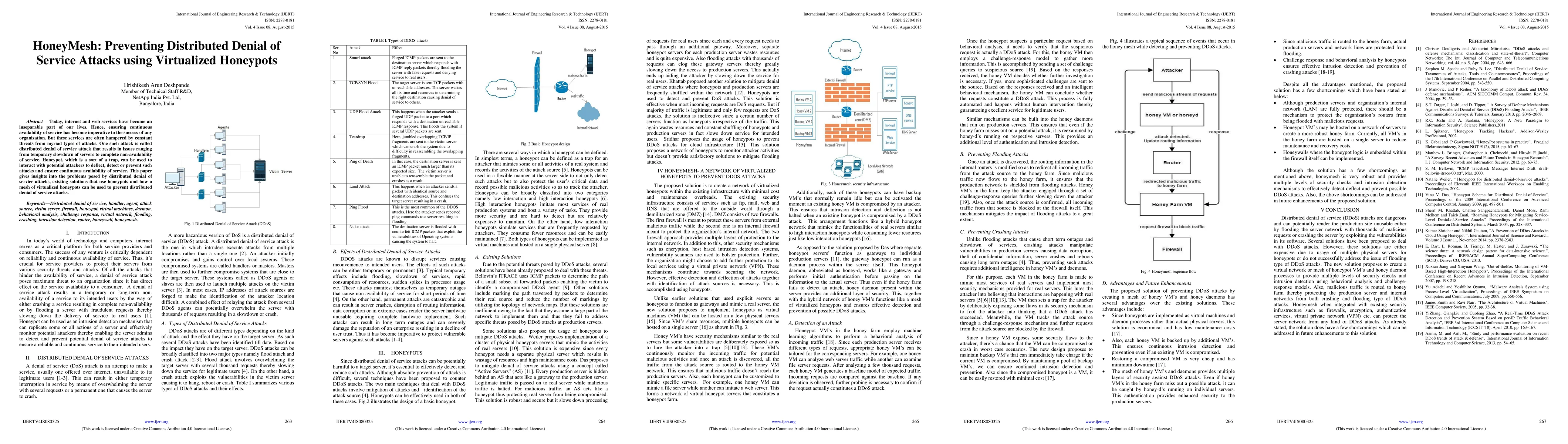 HoneyMesh employs a network of virtualized honeypots to proactively detect and mitigate distributed denial of service attacks, enhancing the resilience and availability of internet services. This innovative approach leverages the interaction with potential attackers to prevent service disruptions and improve overall security.
