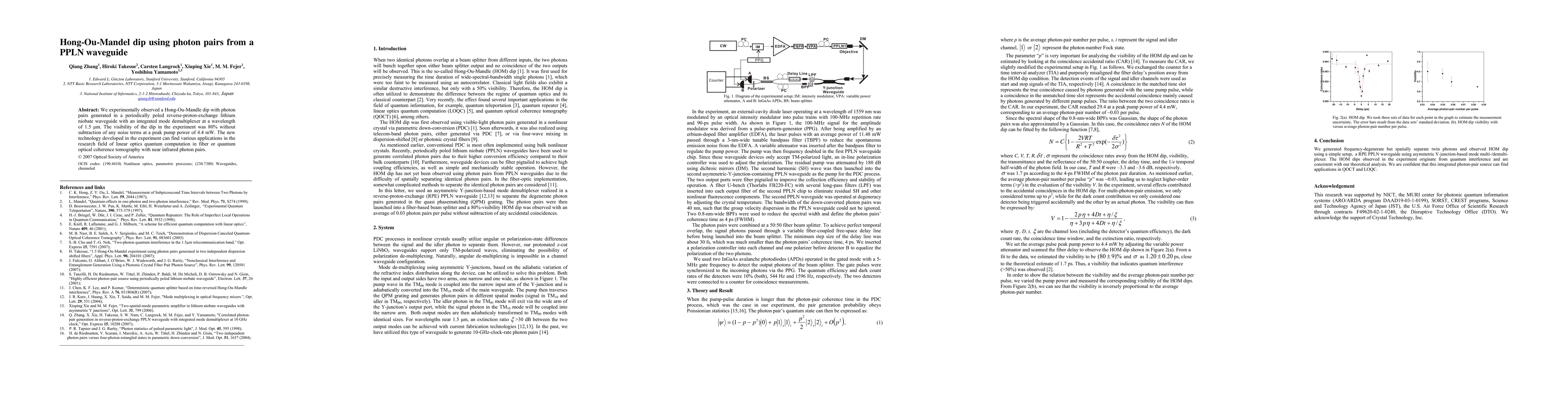 Researchers successfully created a Hong-Ou-Mandel dip using photon pairs in a lithium niobate waveguide, achieving 80% visibility without noise subtraction at 1.5 um wavelength.