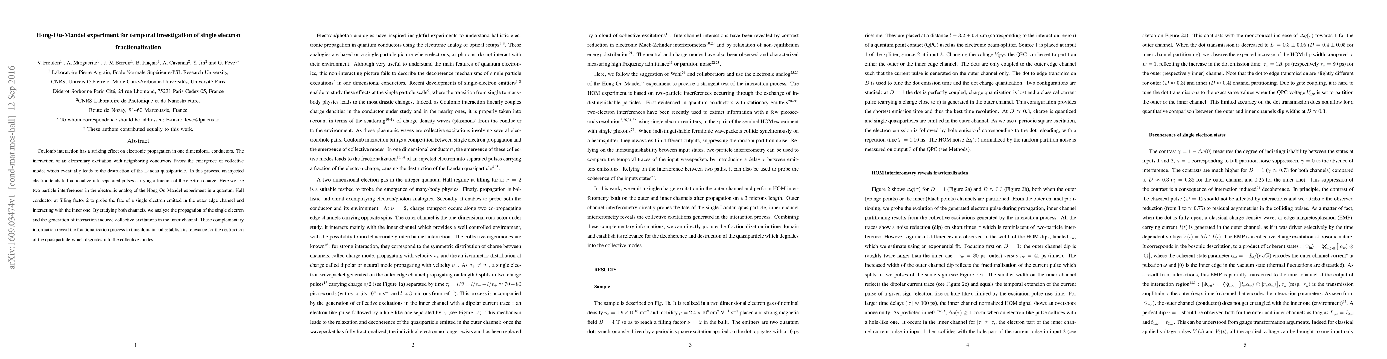 Coulomb interaction has a striking effect on electronic propagation in one dimensional conductors. The interaction of an elementary excitation with neighboring conductors favors the emergence of collective modes which eventually leads to the destruction of the Landau quasiparticle. In this process, an injected electron tends to fractionalize into separated pulses carrying a fraction of the electron charge. Here we use two-particle interferences in the electronic analog of the Hong-Ou-Mandel experiment in a quantum Hall conductor at filling factor 2 to probe the fate of a single electron emitted in the outer edge channel and interacting with the inner one. By studying both channels, we analyze the propagation of the single electron and the generation of interaction induced collective excitations in the inner channel. These complementary information reveal the fractionalization process in time domain and establish its relevance for the destruction of the quasiparticle which degrades into the collective modes.