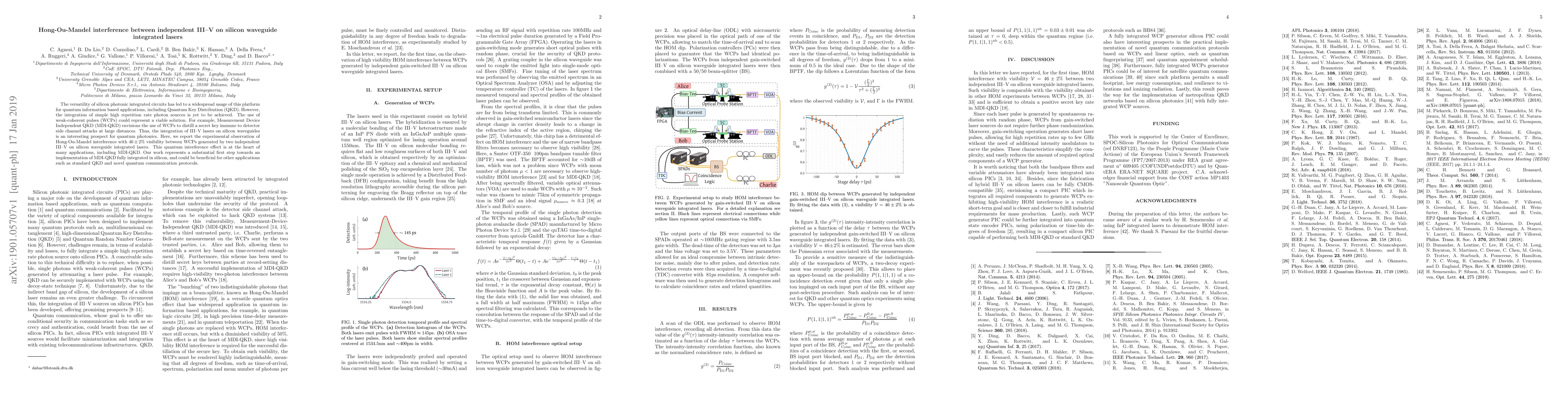 The versatility of silicon photonic integrated circuits has led to a widespread usage of this platform for quantum information based applications, including Quantum Key Distribution (QKD). However, the integration of simple high repetition rate photon sources is yet to be achieved. The use of weak-coherent pulses (WCPs) could represent a viable solution. For example, Measurement Device Independent QKD (MDI-QKD) envisions the use of WCPs to distill a secret key immune to detector side channel attacks at large distances. Thus, the integration of III-V lasers on silicon waveguides is an interesting prospect for quantum photonics. Here, we report the experimental observation of Hong-Ou-Mandel interference with 46\pm 2% visibility between WCPs generated by two independent III-V on silicon waveguide integrated lasers. This quantum interference effect is at the heart of many applications, including MDI-QKD. Our work represents a substantial first step towards an implementation of MDI-QKD fully integrated in silicon, and could be beneficial for other applications such as standard QKD and novel quantum communication protocols.
