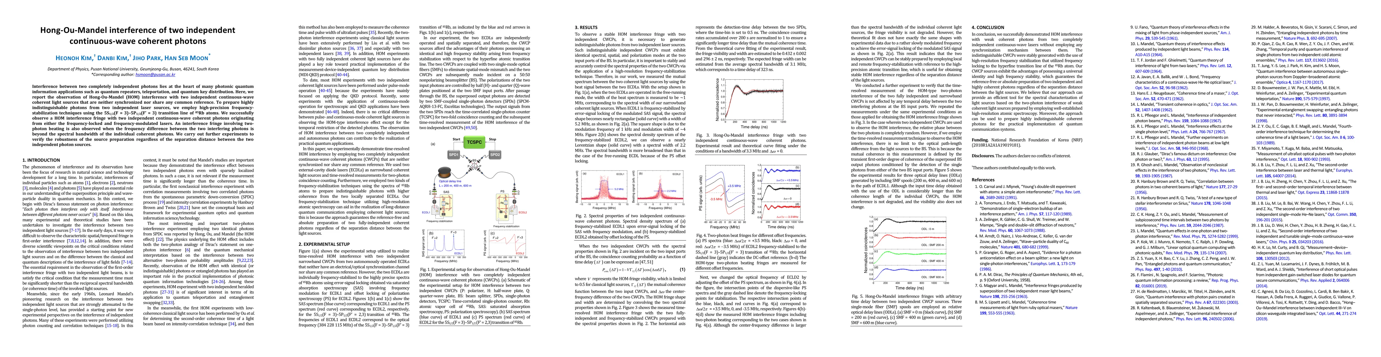 This paper reports the observation of Hong-Ou-Mandel (HOM) interference between two independent continuous-wave coherent photons from separate laser sources, employing high-precision frequency-stabilization techniques. The study demonstrates the robustness of this interference regardless of the distance between the photon sources, highlighting its potential for quantum information applications.