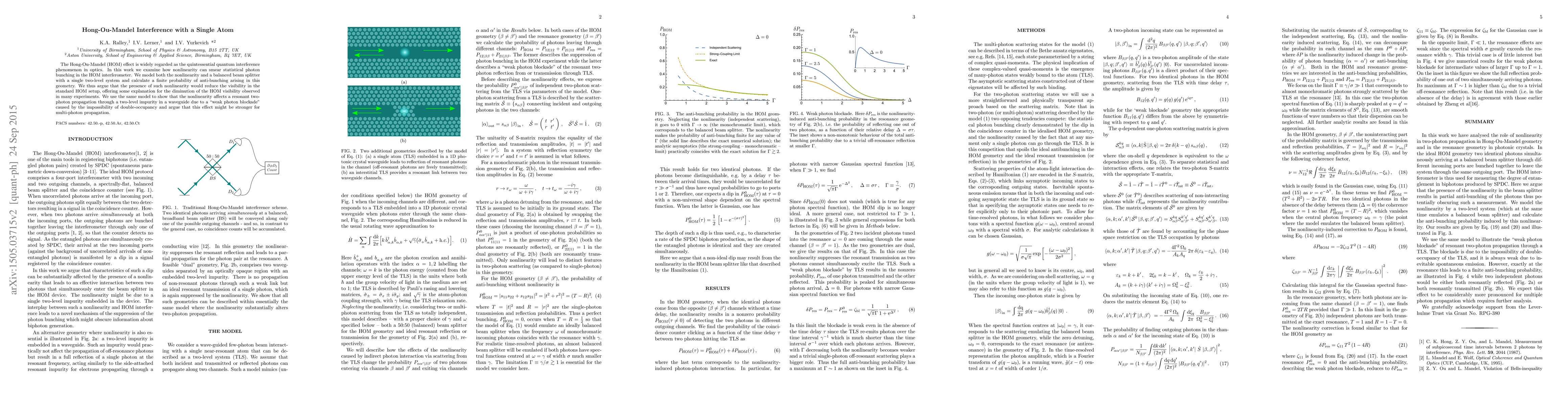 The Hong-Ou-Mandel (HOM) effect is widely regarded as the quintessential quantum interference phenomenon in optics. In this work we examine how nonlinearity can smear statistical photon bunching in the HOM interferometer. We model both the nonlinearity and a balanced beam splitter with a single two-level system and calculate a finite probability of anti-bunching arising in this geometry. We thus argue that the presence of such nonlinearity would reduce the visibility in the standard HOM setup, offering some explanation for the diminution of the HOM visibility observed in many experiments. We use the same model to show that the nonlinearity affects a resonant two-photon propagation through a two-level impurity in a waveguide due to a "weak photon blockade" caused by the impossibility of double-occupancy and argue that this effect might be stronger for multi-photon propagation.