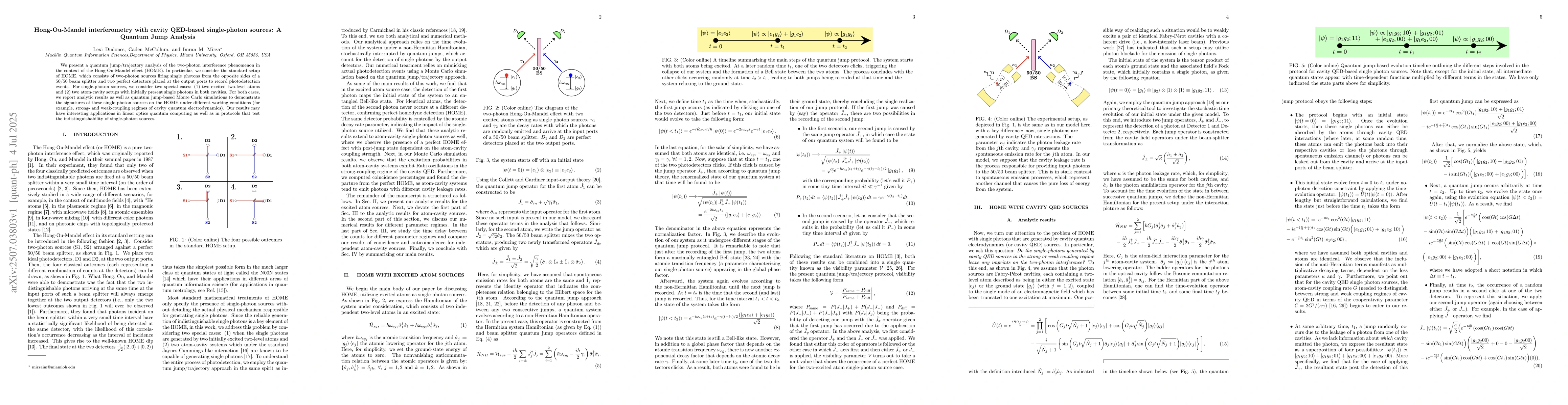 We present a quantum jump/trajectory analysis of the two-photon interference phenomenon in the context of the Hong-Ou-Mandel effect (HOME). In particular, we consider the standard setup of HOME, which consists of two-photon sources firing single photons from the opposite sides of a 50/50 beam splitter and two perfect detectors placed at the output ports to record photodetection events. For single-photon sources, we consider two special cases: (1) two excited two-level atoms and (2) two atom-cavity setups with initially present single photons in both cavities. For both cases, we report analytic results as well as quantum jump-based Monte Carlo simulations to demonstrate the signatures of these single-photon sources on the HOME under different working conditions (for example, strong- and weak-coupling regimes of cavity quantum electrodynamics). Our results may have interesting applications in linear optics quantum computing as well as in protocols that test the indistinguishability of single-photon sources.