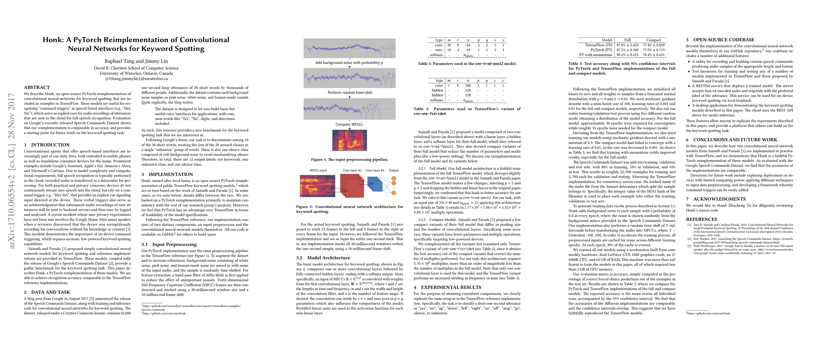 Honk is an open-source PyTorch reimplementation of convolutional neural networks for keyword spotting, demonstrating comparable accuracy to TensorFlow examples on the Speech Commands Dataset. It serves as a foundation for recognizing "command triggers" in speech-based interfaces.