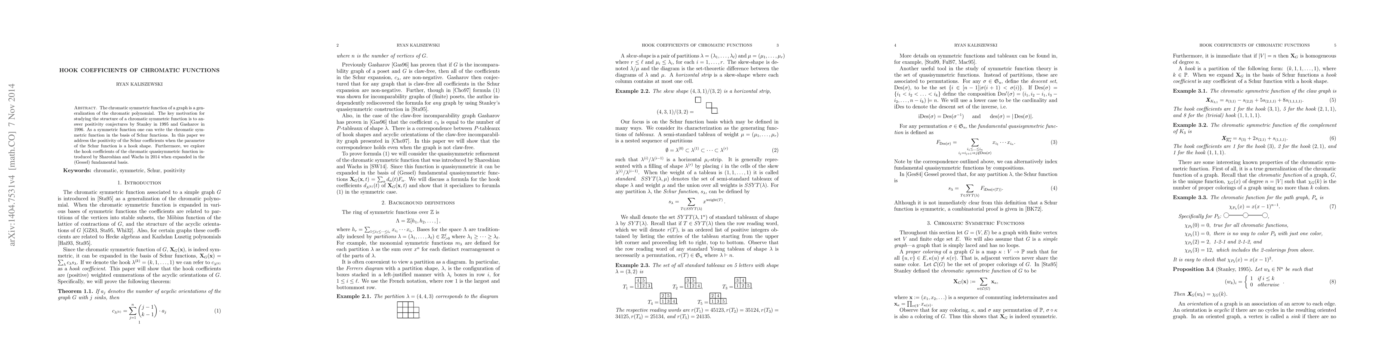 This paper investigates the Schur coefficients of chromatic symmetric functions when the parameter is a hook shape, aiming to address Stanley and Gasharov's positivity conjectures. It also constructs a correspondence between acyclic orientations of certain graphs and P-tableaux with a hook shape.