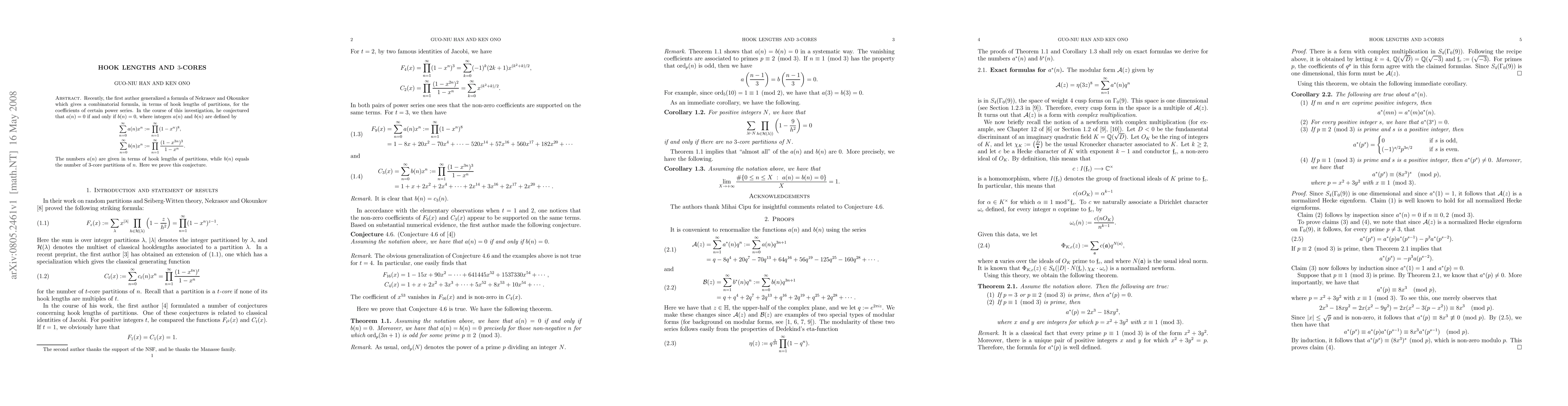 The paper proves a conjecture linking the hook lengths of partitions to 3-core partitions, showing that $A000731(n)=0$ if and only if $A033687(n)=0$, where $A000731(n)$ relates to hook lengths and $A033687(n)$ counts 3-core partitions.