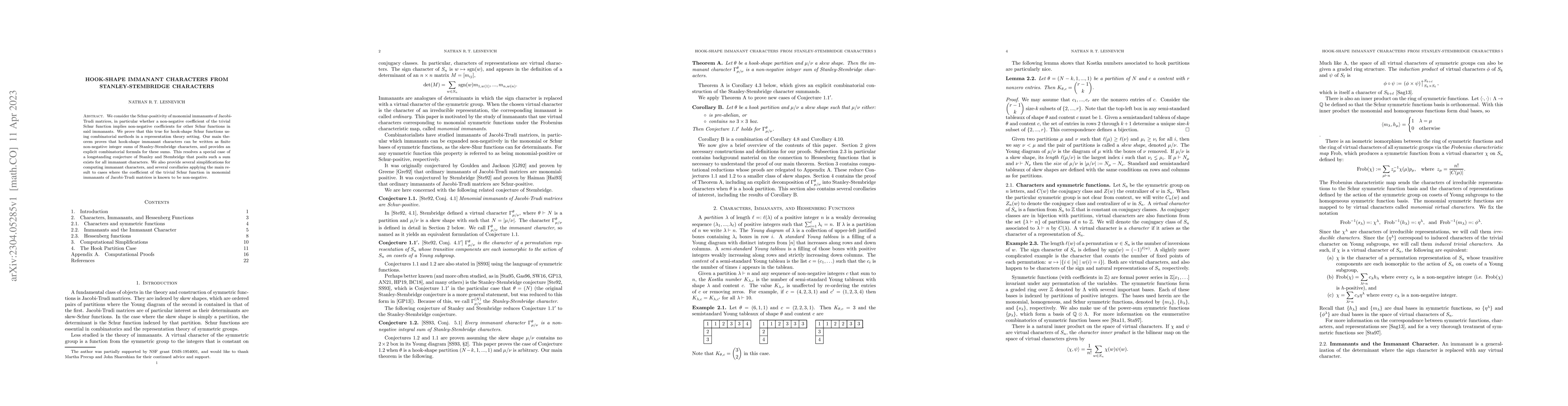 This paper proves Schur-positivity for hook-shape immanant characters, showing they can be expressed as non-negative integer sums of Stanley-Stembridge characters. It resolves a special case of a conjecture by Stanley and Stembridge, providing an explicit combinatorial formula for these sums.