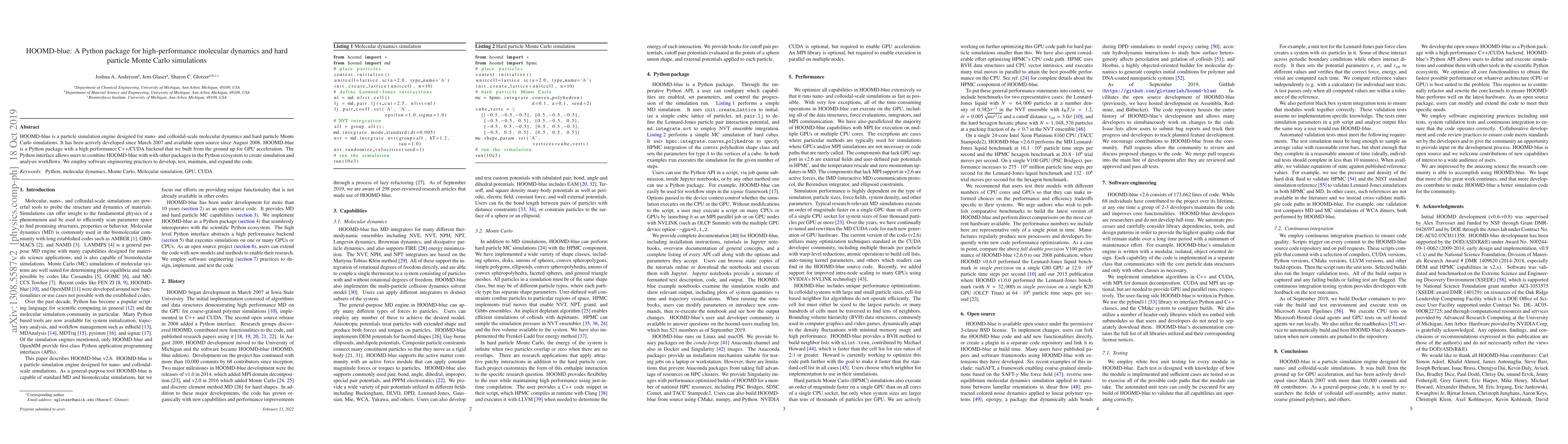 HOOMD-blue is an open-source Python package for high-performance molecular dynamics and Monte Carlo simulations, utilizing a C++/CUDA backend for GPU acceleration. It enables users to integrate it with other Python packages for comprehensive simulation workflows.