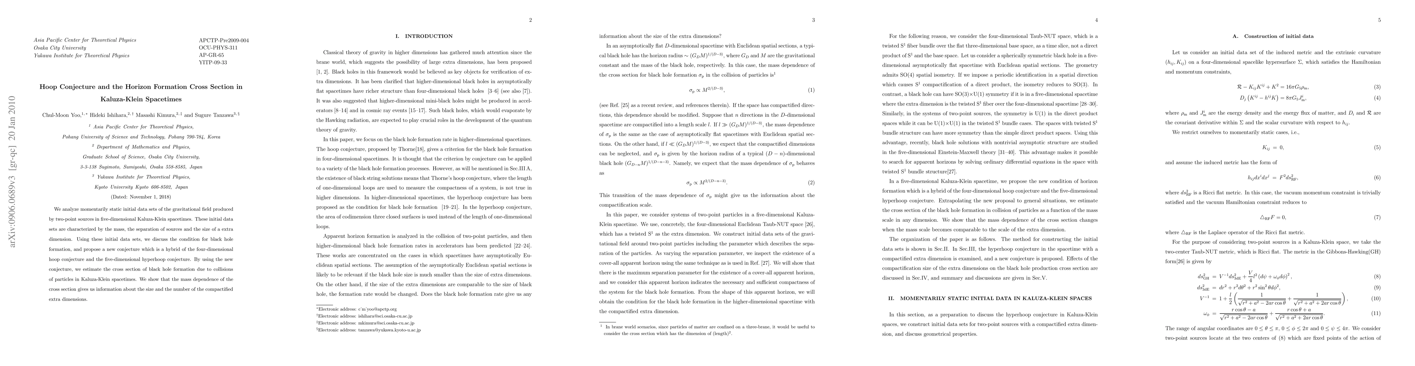 We analyze momentarily static initial data sets of the gravitational field produced by two-point sources in five-dimensional Kaluza-Klein spacetimes. These initial data sets are characterized by the mass, the separation of sources and the size of a extra dimension. Using these initial data sets, we discuss the condition for black hole formation, and propose a new conjecture which is a hybrid of the four-dimensional hoop conjecture and the five-dimensional hyperhoop conjecture. By using the new conjecture, we estimate the cross section of black hole formation due to collisions of particles in Kaluza-Klein spacetimes. We show that the mass dependence of the cross section gives us information about the size and the number of the compactified extra dimensions.