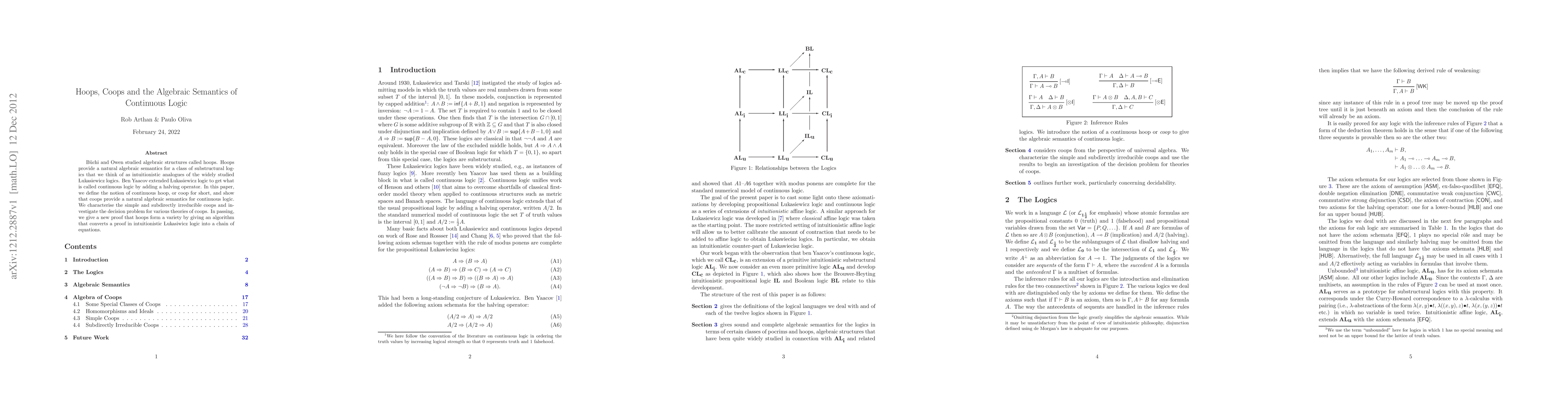 B\"{u}chi and Owen studied algebraic structures called hoops. Hoops provide a natural algebraic semantics for a class of substructural logics that we think of as intuitionistic analogues of the widely studied {\L}ukasiewicz logics. Ben Yaacov extended {\L}ukasiewicz logic to get what is called continuous logic by adding a halving operator. In this paper, we define the notion of continuous hoop, or coop for short, and show that coops provide a natural algebraic semantics for continuous logic. We characterise the simple and subdirectly irreducible coops and investigate the decision problem for various theories of coops. In passing, we give a new proof that hoops form a variety by giving an algorithm that converts a proof in intuitionistic {\L}ukaseiwicz logic into a chain of equations.