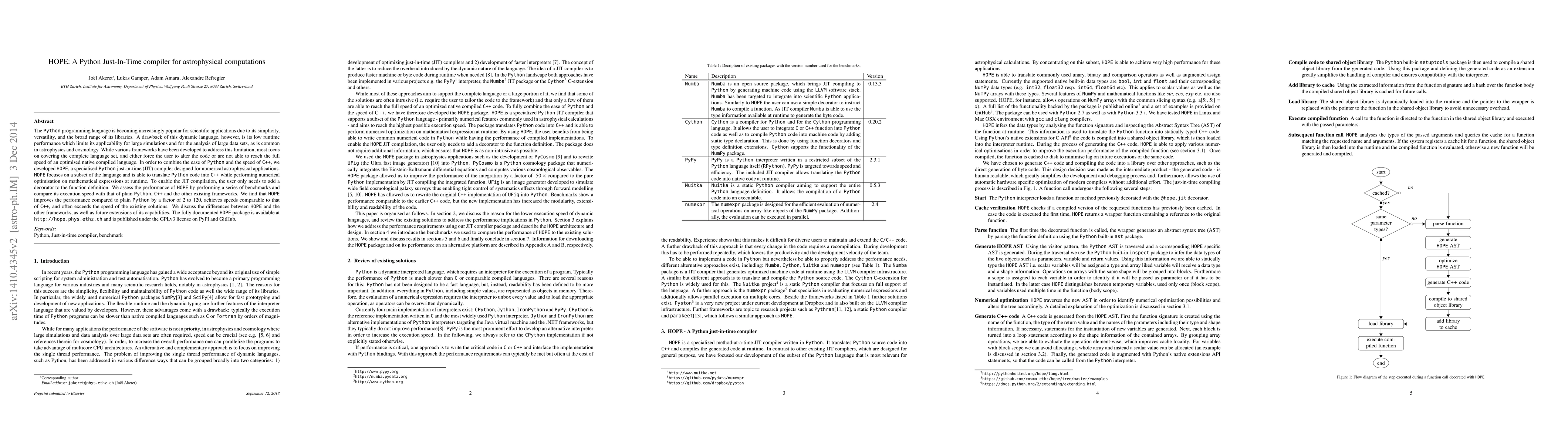 The research introduces HOPE, a specialized Python just-in-time (JIT) compiler tailored for numerical astrophysical applications. HOPE focuses on a subset of Python language features, translating Python code into C++ and performing numerical optimizations on mathematical expressions at runtime.