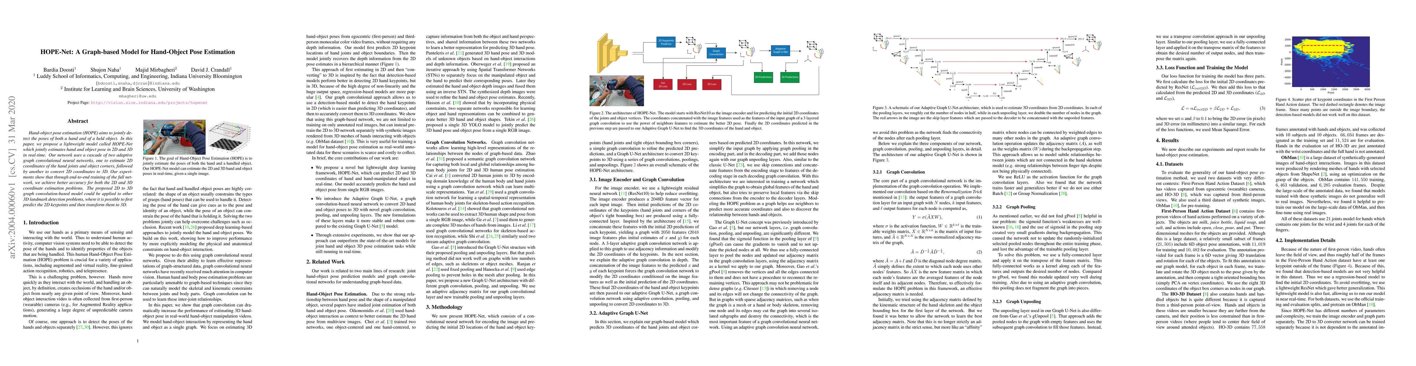 HOPE-Net is a lightweight graph-based model for real-time hand-object pose estimation, utilizing adaptive graph convolutional networks to estimate 2D and 3D coordinates. The model achieves improved accuracy through end-to-end training and can be applied to other 3D landmark detection tasks.