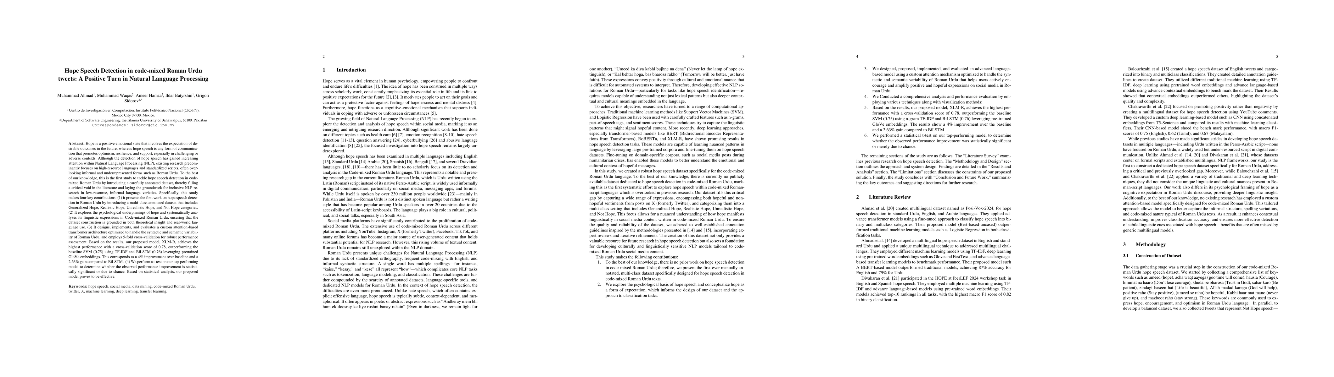 Hope is a positive emotional state involving the expectation of favorable future outcomes, while hope speech refers to communication that promotes optimism, resilience, and support, particularly in adverse contexts. Although hope speech detection has gained attention in Natural Language Processing (NLP), existing research mainly focuses on high-resource languages and standardized scripts, often overlooking informal and underrepresented forms such as Roman Urdu. To the best of our knowledge, this is the first study to address hope speech detection in code-mixed Roman Urdu by introducing a carefully annotated dataset, thereby filling a critical gap in inclusive NLP research for low-resource, informal language varieties. This study makes four key contributions: (1) it introduces the first multi-class annotated dataset for Roman Urdu hope speech, comprising Generalized Hope, Realistic Hope, Unrealistic Hope, and Not Hope categories; (2) it explores the psychological foundations of hope and analyzes its linguistic patterns in code-mixed Roman Urdu to inform dataset development; (3) it proposes a custom attention-based transformer model optimized for the syntactic and semantic variability of Roman Urdu, evaluated using 5-fold cross-validation; and (4) it verifies the statistical significance of performance gains using a t-test. The proposed model, XLM-R, achieves the best performance with a cross-validation score of 0.78, outperforming the baseline SVM (0.75) and BiLSTM (0.76), with gains of 4% and 2.63% respectively.