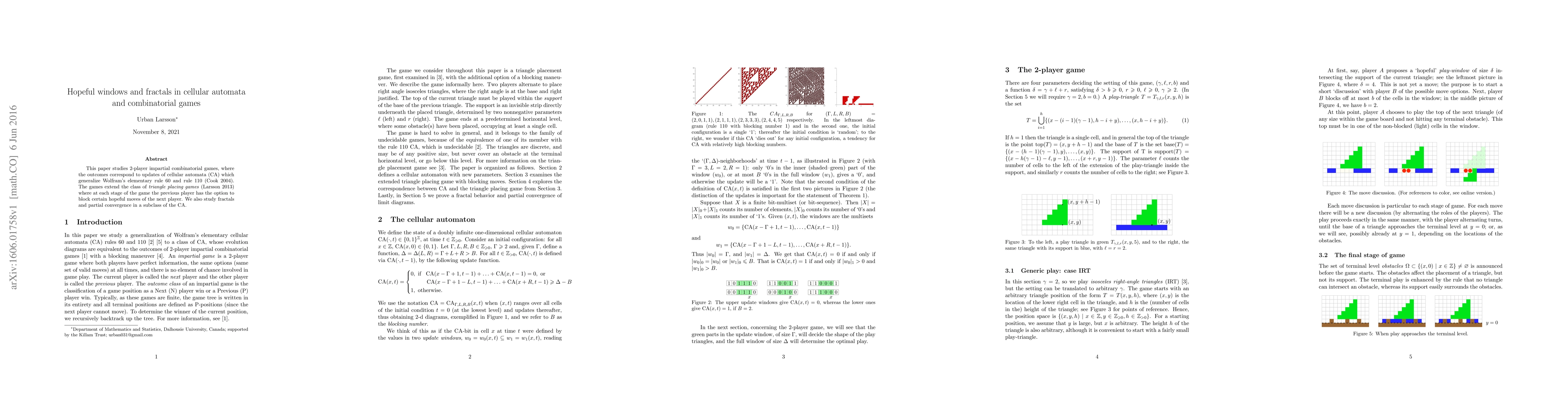 This paper explores 2-player impartial combinatorial games linked to cellular automata updates, extending triangle placing games and investigating fractals and partial convergence in a specific subclass of these automata.