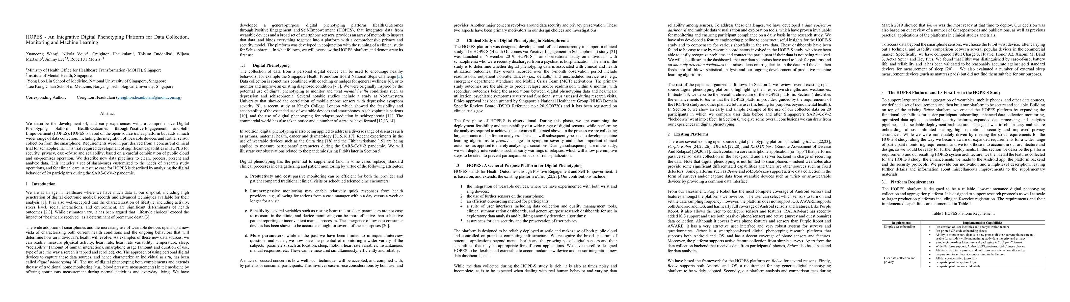 We describe the development of, and early experiences with, comprehensive Digital Phenotyping platform: Health Outcomes through Positive Engagement and Self-Empowerment (HOPES). HOPES is based on the open-source Beiwe platform but adds a much wider range of data collection, including the integration of wearable data sources and further sensor collection from the smartphone. Requirements were in part derived from a concurrent clinical trial for schizophrenia. This trial required development of significant capabilities in HOPES in security, privacy, ease-of-use and scalability, based on a careful combination of public cloud and on-premises operation. We describe new data pipelines to clean, process, present and analyze data. This includes a set of dashboards customized to the needs of the research study operations and for clinical care. A test use of HOPES is described by analyzing the digital behaviors of 20 participants during the SARS-CoV-2 pandemic.
