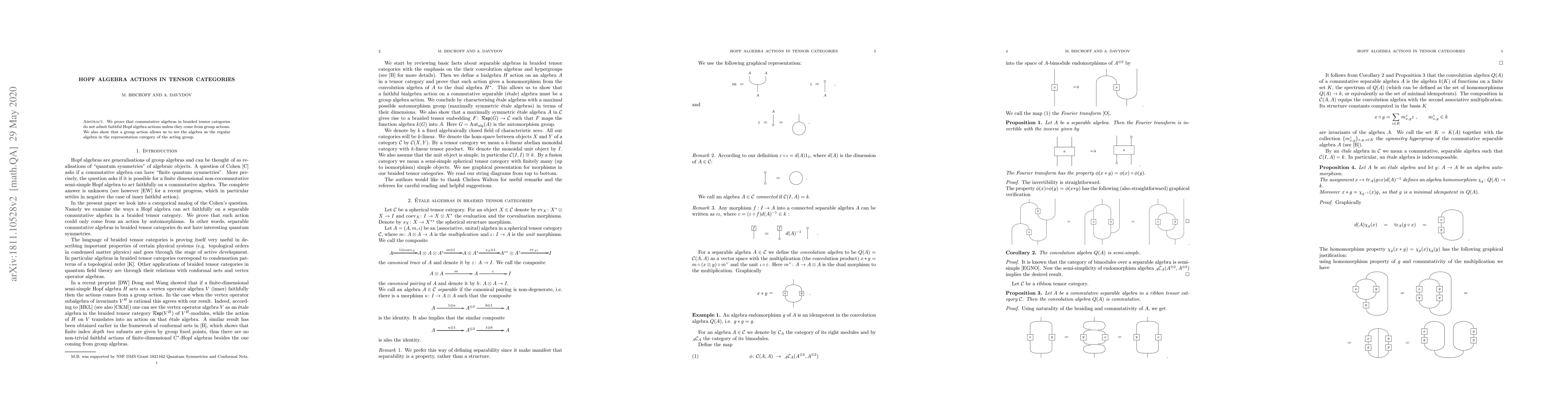 Summary: The paper demonstrates that commutative algebras in braided tensor categories lack faithful Hopf algebra actions except when derived from group actions, which can be viewed as regular algebras in the representation category of the acting group.