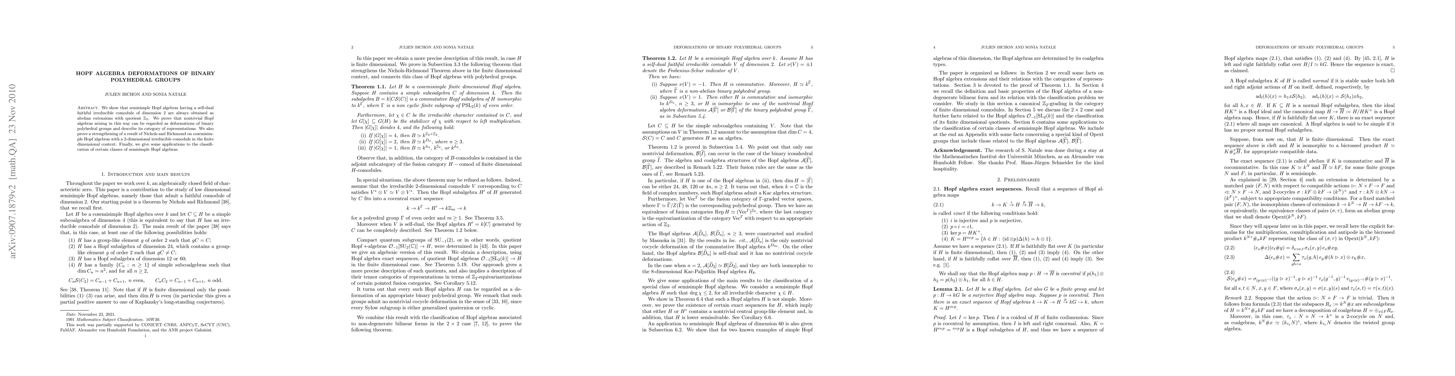This paper demonstrates that semisimple Hopf algebras with a self-dual faithful irreducible comodule of dimension 2 arise as abelian extensions with quotient Z_2, and are deformations of binary polyhedral groups, describing their representation category. It also reinforces a theorem on cosemisimple Hopf algebras and applies these findings to classify specific classes of semisimple Hopf algebras.