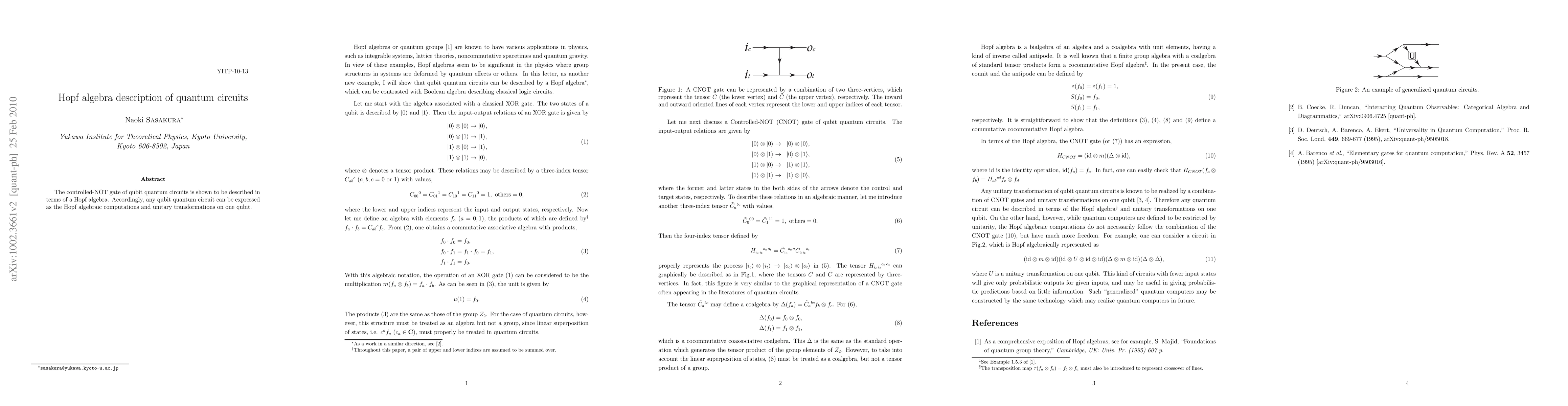 The controlled-NOT gate of qubit quantum circuits is shown to be described in terms of a Hopf algebra. Accordingly, any qubit quantum circuit can be expressed as the Hopf algebraic computations and unitary transformations on one qubit.