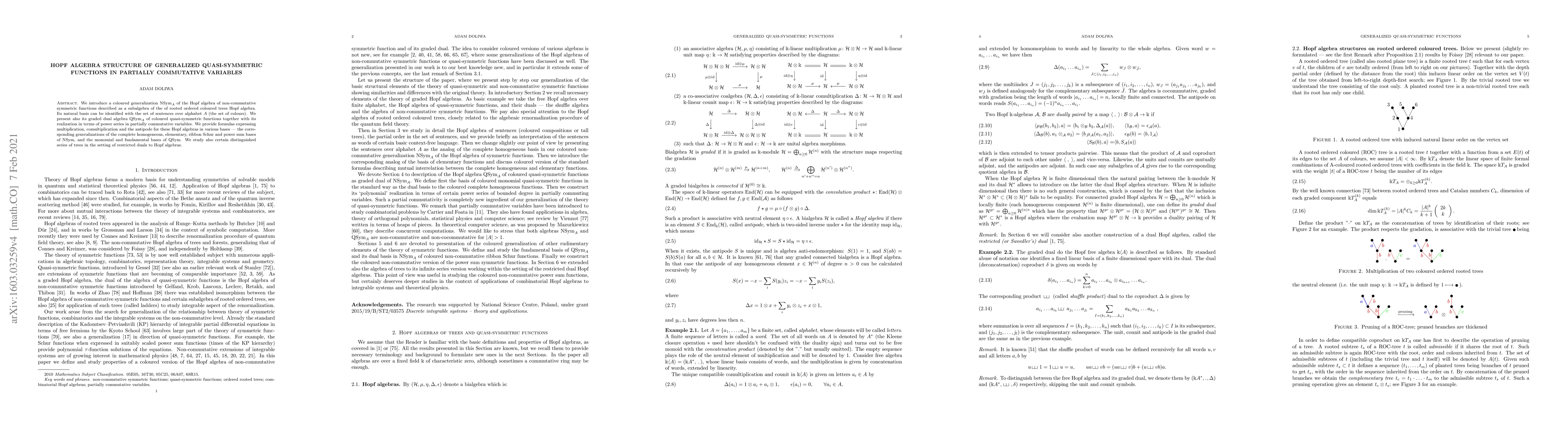 We introduce a coloured generalization $\mathrm{NSym}_A$ of the Hopf algebra of non-commutative symmetric functions described as a subalgebra of the of rooted ordered coloured trees Hopf algebra. Its natural basis can be identified with the set of sentences over alphabet $A$ (the set of colours). We present also its graded dual algebra $\mathrm{QSym}_A$ of coloured quasi-symmetric functions together with its realization in terms of power series in partially commutative variables. We provide formulas expressing multiplication, comultiplication and the antipode for these Hopf algebras in various bases -- the corresponding generalizations of the complete homogeneous, elementary, ribbon Schur and power sum bases of $\mathrm{NSym}$, and the monomial and fundamental bases of $\mathrm{QSym}$. We study also certain distinguished series of trees in the setting of restricted duals to Hopf algebras.