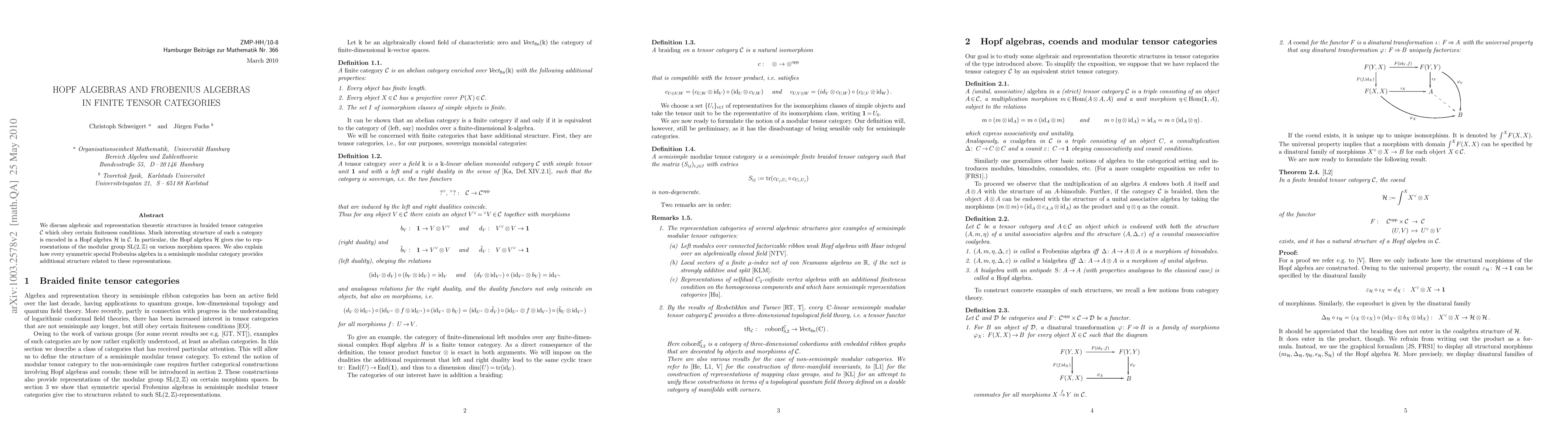 We discuss algebraic and representation theoretic structures in braided tensor categories C which obey certain finiteness conditions. Much interesting structure of such a category is encoded in a Hopf algebra H in C. In particular, the Hopf algebra H gives rise to representations of the modular group SL(2,Z) on various morphism spaces. We also explain how every symmetric special Frobenius algebra in a semisimple modular category provides additional structure related to these representations.