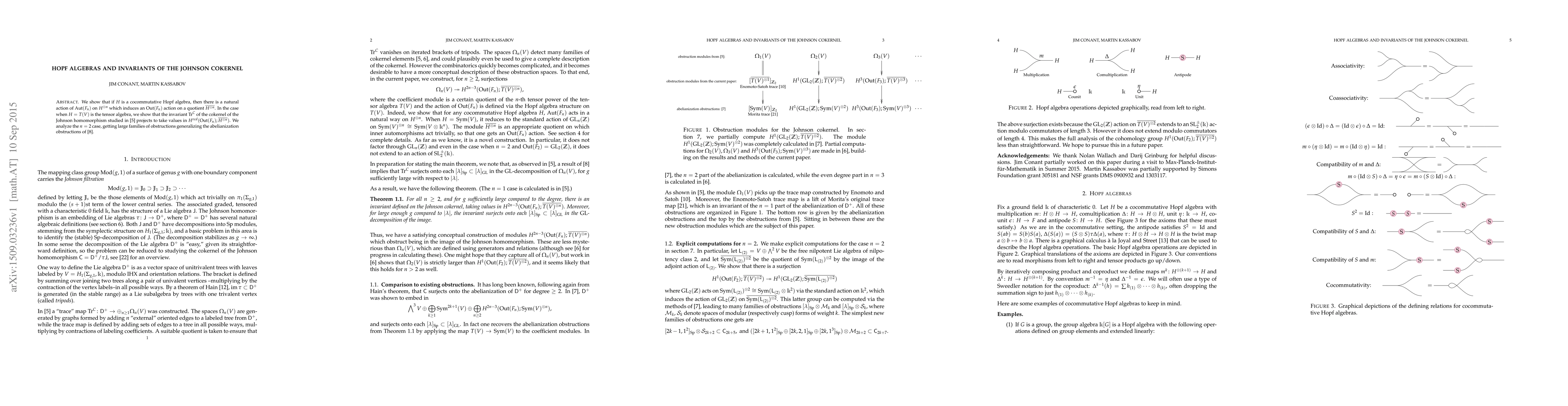 We show that if H is a cocommutative Hopf algebra, then there is a natural action of Aut(F_n) on the nth tensor power of H which induces an Out(F_n) action on a quotient \overline{H^{\otimes n}}. In the case when H=T(V) is the tensor algebra, we show that the invariant Tr^C of the cokernel of the Johnson homomorphism studied in [J. Conant, The Johnson cokernel and the Enomoto-Satoh invariant, Algebraic and Geometric Topology, 15 (2015), no. 2, 801--821.] projects to take values in the top dimensional cohomology of Out(F_n) with coefficients in \overline{H^{\otimes n}}. We analyze the n=2 case, getting large families of obstructions generalizing the abelianization obstructions of [J. Conant, M. Kassabov, K. Vogtmann, Higher hairy graph homology, Journal of Topology, Geom. Dedicata 176 (2015), 345--374.].