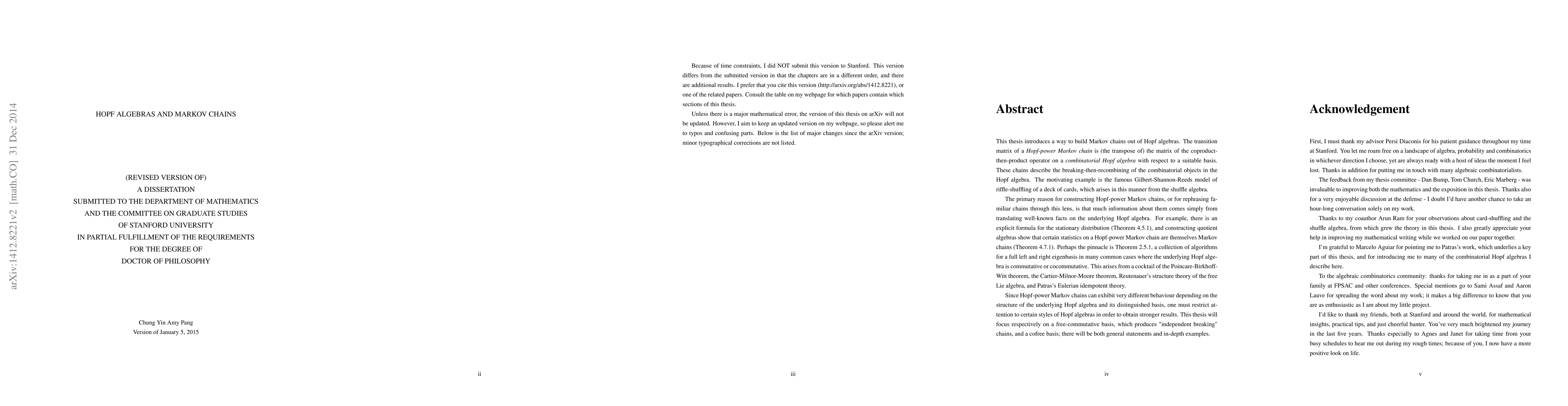 This thesis constructs Markov chains from Hopf algebras, termed "Hopf-power Markov chains," where the transition matrix derives from the coproduct-then-product operator. It explores the riffle-shuffling model as a motivating example and highlights the benefits of this approach, including explicit formulas for stationary distributions and algorithms for eigenbasis construction.