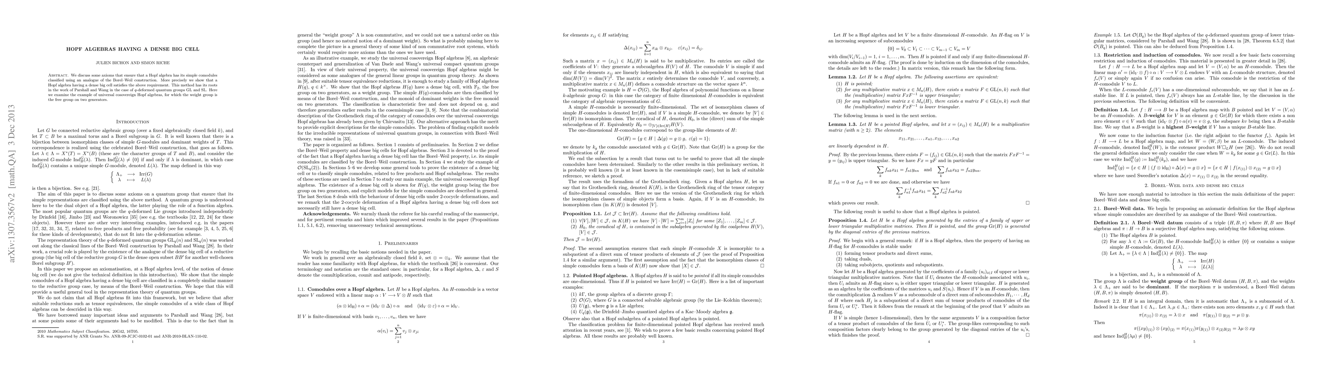 The paper introduces and utilizes the concept of a 'dense big cell' in Hopf algebras, providing a framework for classifying simple comodules through an analogue of the Borel-Weil construction.