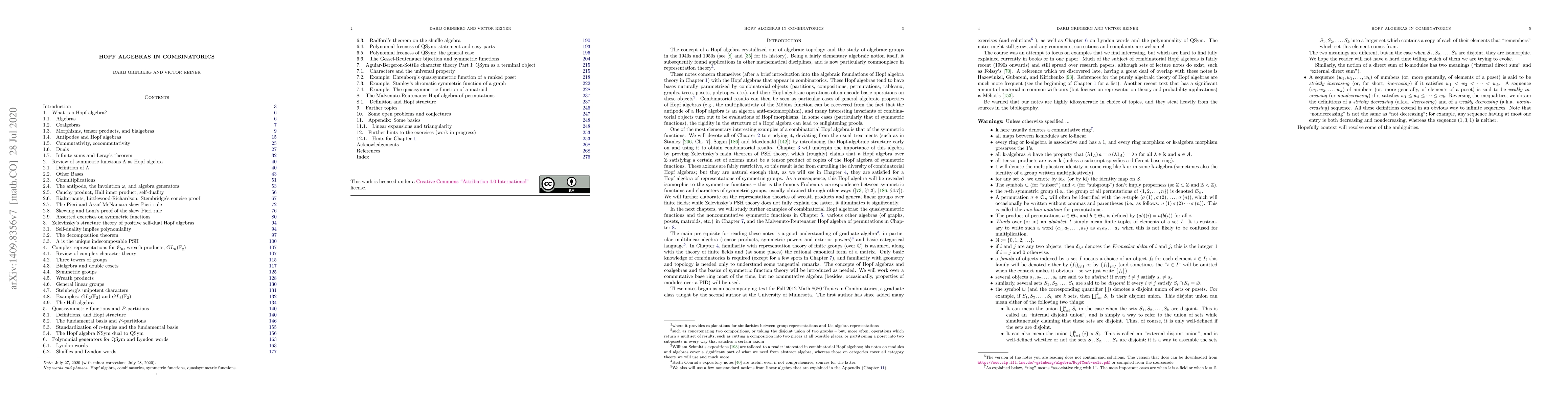 These notes -- originating from a one-semester class by their second author at the University of Minnesota -- survey some of the most important Hopf algebras appearing in combinatorics. After introducing coalgebras, bialgebras and Hopf algebras in general, we study the Hopf algebra of symmetric functions, including Zelevinsky's axiomatic characterization of it as a "positive self-adjoint Hopf algebra" and its application to the representation theory of symmetric and (briefly) finite general linear groups. The notes then continue with the quasisymmetric and the noncommutative symmetric functions, some Hopf algebras formed from graphs, posets and matroids, and the Malvenuto-Reutenauer Hopf algebra of permutations. Among the results surveyed are the Littlewood-Richardson rule and other symmetric function identities, Zelevinsky's structure theorem for PSHs, the antipode formula for P-partition enumerators, the Aguiar-Bergeron-Sottile universal property of QSym, the theory of Lyndon words, the Gessel-Reutenauer bijection, and Hazewinkel's polynomial freeness of QSym. The notes are written with a graduate student reader in mind, being mostly self-contained but requiring a good familiarity with multilinear algebra and -- for the representation-theory applications -- basic group representation theory.