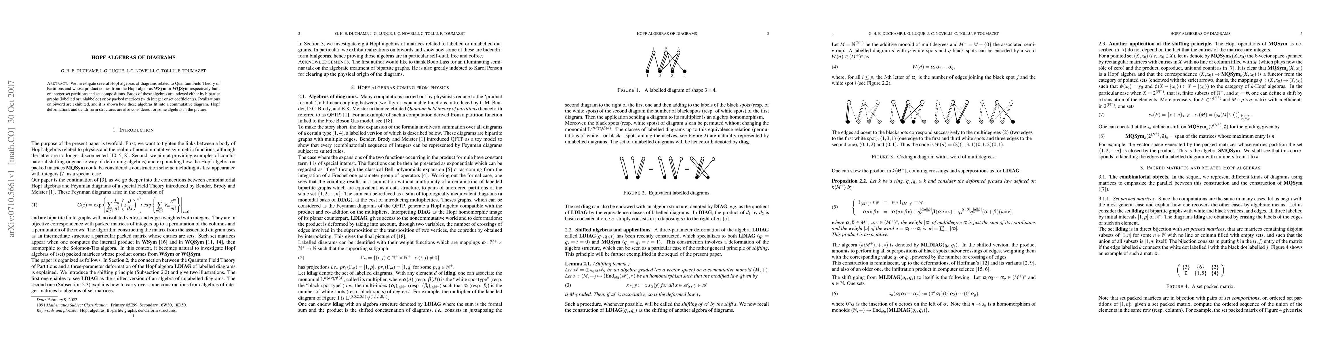 This paper explores Hopf algebras associated with diagrams relevant to Quantum Field Theory of Partitions, using bases indexed by bipartite graphs or packed matrices. It discusses realizations via biwords, embedding these algebras into a commutative diagram, and examines Hopf deformations and dendriform structures.