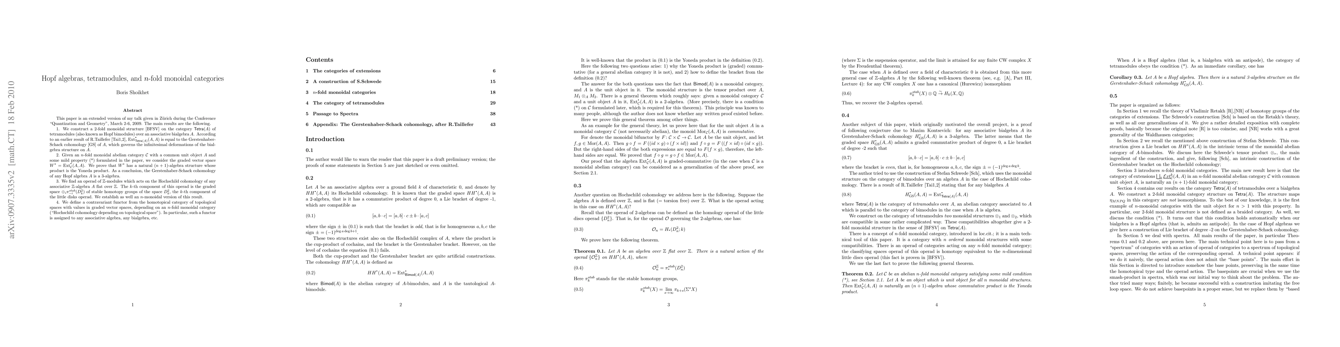 The abelian category of tetramodules over an associative bialgebra $A$ is related with the Gerstenhaber-Schack (GS) cohomology as $Ext_\Tetra(A,A)=H_\GS(A)$. We construct a 2-fold monoidal structure on the category of tetramodules of a bialgebra. Suppose $C$ is an abelian $n$-fold monoidal category with the unit object $A$. We prove, provided some condition (*), that $Ext_C(A,A)$ is an $(n+1)$-algebra. In the case of bialgebras this condition (*) is satisfied when $A$ is a Hopf algebra. Finally, the GS cohomology of a Hopf algebra is a 3-algebra. As well, we consider this kind of questions of (bi)algebras over integers. Let $A$ be an associative algebra over $Z$ flat over $Z$. We prove that the operad acting on its Hochschild cohomology is the operad of stable homotopy groups of the little discs operad.