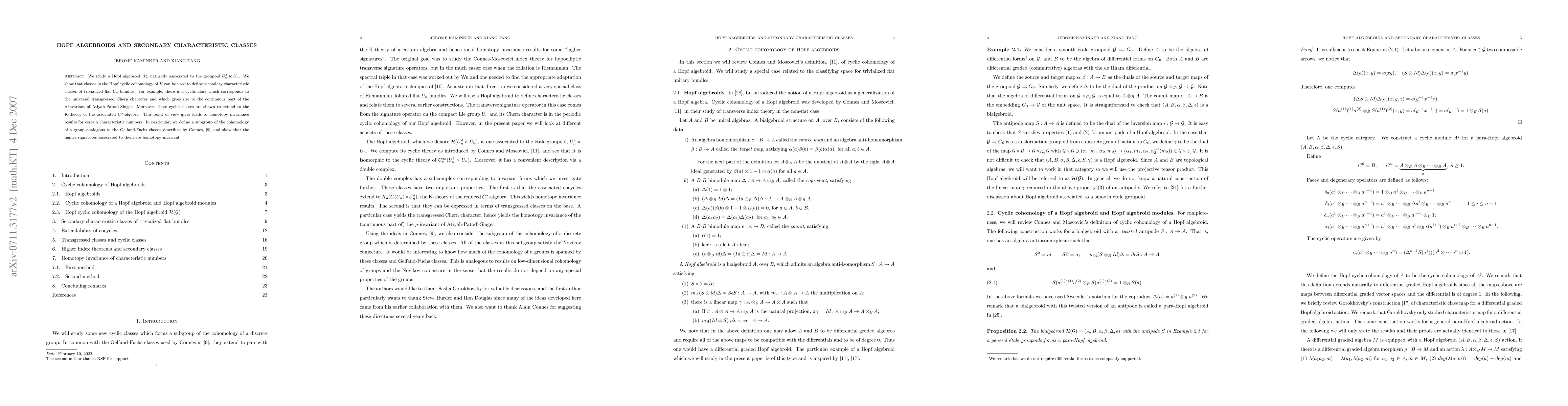 This paper investigates Hopf algebroids associated with groupoids and demonstrates that their cyclic cohomology can define secondary characteristic classes for trivialized flat $U_n$-bundles, including a cyclic class corresponding to the universal transgressed Chern character. It further establishes homotopy invariance for certain characteristic numbers and higher signatures.