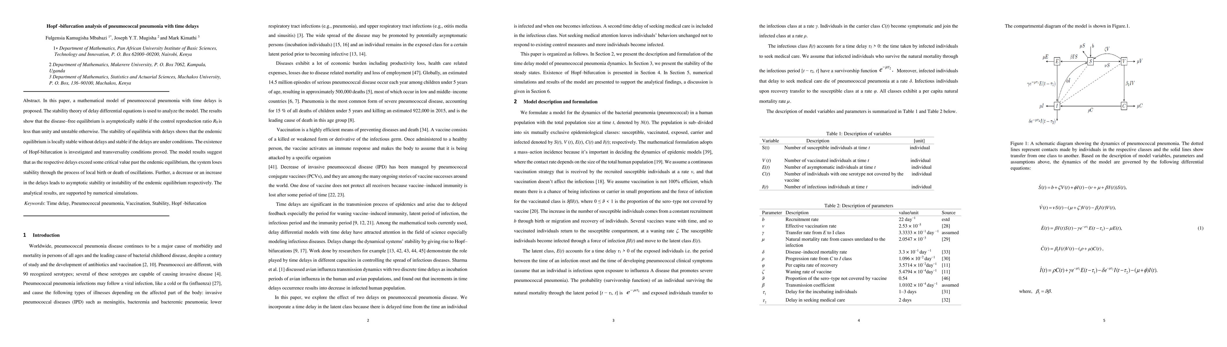 In this paper, a mathematical model of pneumococcal pneumonia with time delays is proposed. The stability theory of delay differential equations is used to analyze the model. The results show that the disease-free equilibrium is asymptotically stable if the control reproduction ratio R0 is less than unity and unstable otherwise. The stability of equilibria with delays shows that the endemic equilibrium is locally stable without delays and stable if the delays are under conditions. The existence of Hopf-bifurcation is investigated and transversality conditions proved. The model results suggest that as the respective delays exceed some critical value past the endemic equilibrium, the system loses stability through the process of local birth or death of oscillations. Further, a decrease or an increase in the delays leads to asymptotic stability or instability of the endemic equilibrium respectively. The analytical results, are supported by numerical simulations. Keywords: Time delay, Pneumococcal pneumonia, Vaccination, Stability, Hopf-bifurcation