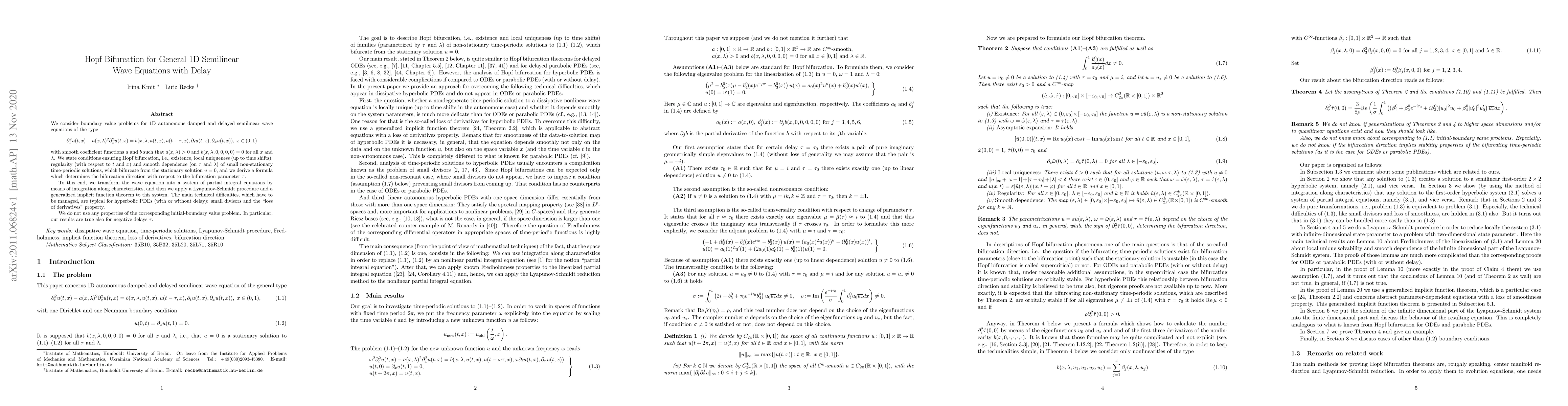 This paper investigates Hopf bifurcation in 1D semilinear wave equations with delay, deriving conditions for the existence and uniqueness of small, non-stationary, time-periodic solutions bifurcating from the stationary solution $u=0$. The authors employ a Lyapunov-Schmidt procedure and a generalized implicit function theorem to manage technical difficulties inherent in hyperbolic PDEs.