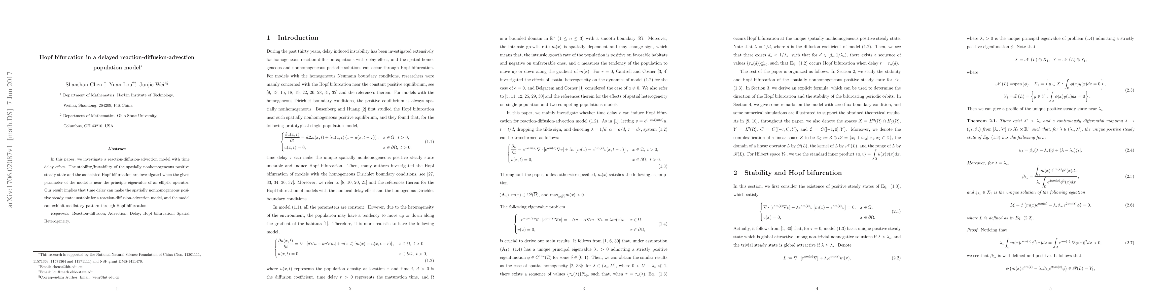 This paper examines a reaction-diffusion-advection model with time delay, finding that the spatially nonhomogeneous steady state can become unstable, leading to oscillatory patterns via Hopf bifurcation when the model parameter approaches the principal eigenvalue of an elliptic operator.